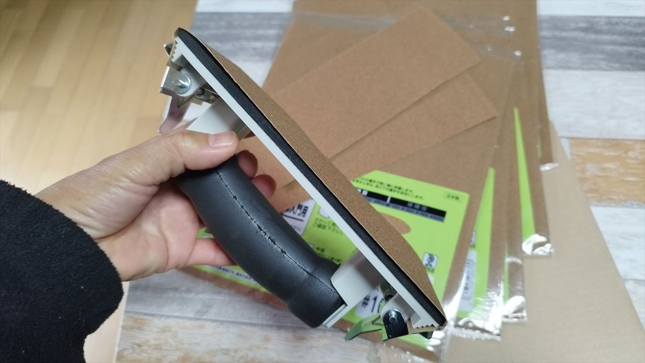 パテが乾いたら、紙やすりで滑らかな平らにして完了です。電動サンダーだと削りすぎちゃうかもと思ったので、手作業用の台座を買いました。