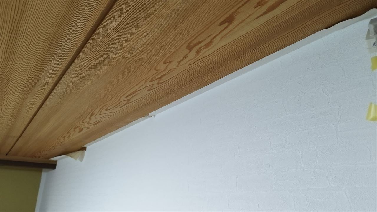 天井の端のあまりをカッターで切る作業をしようとしたところ、ノリが乾いて天井に張り付き、それを剥がそうとすると天井の古い合板の木目模様が剥がれてしまうのです。ドライヤーで温め、壁紙の表面の層だけを剥がし、その下の薄い紙を霧吹きで湿らせてゆっくり剥がすという作業でなんとかなりましたが、1時間半以上無駄にしました。