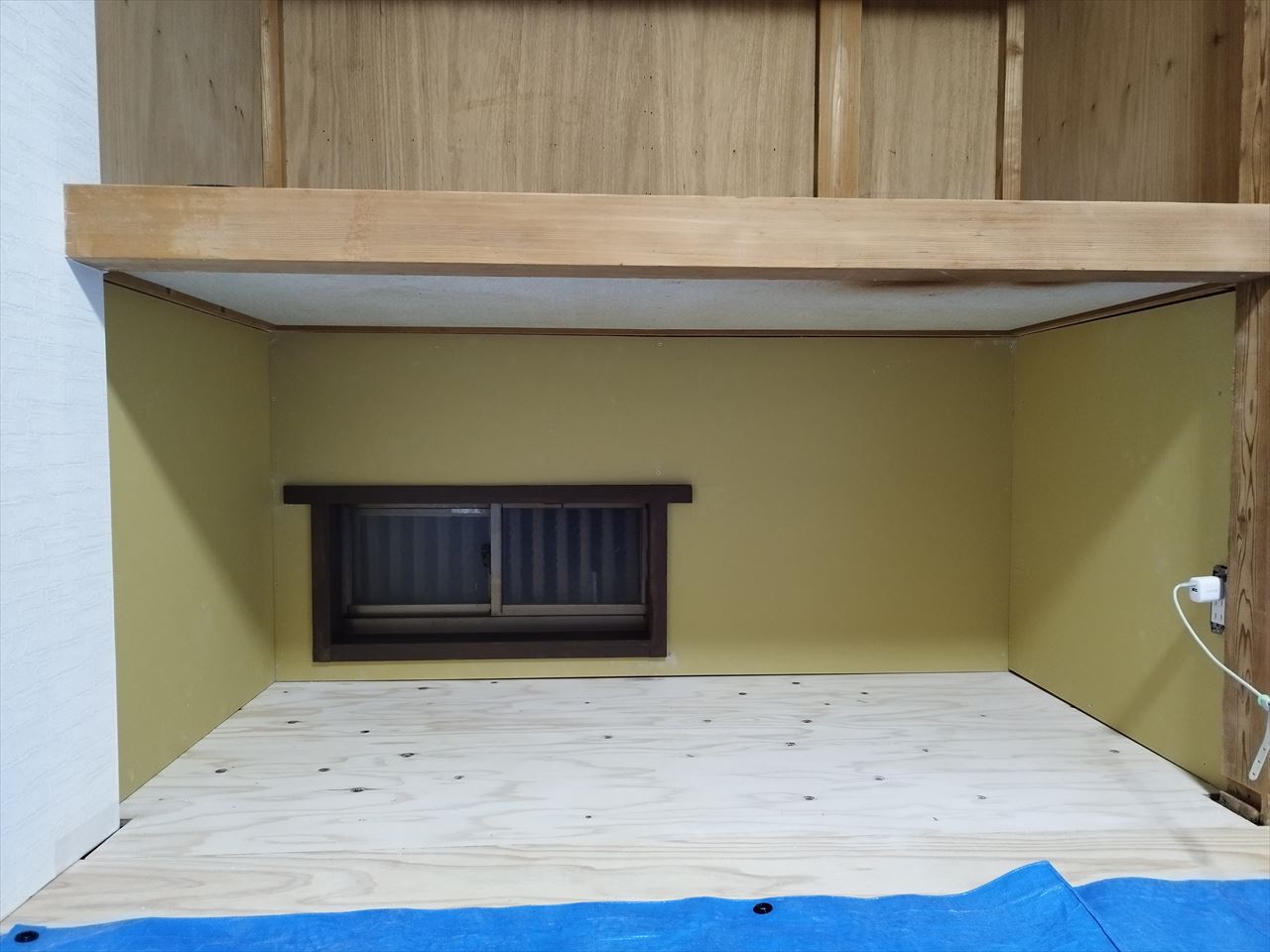 奥の壁は石膏ボードを窓とその周囲の木の形にぴたりくりぬいてハメました。これ1か月前だったら苦戦しまくって最後は石膏ボードを分割したと思うのですが、一発成功。
