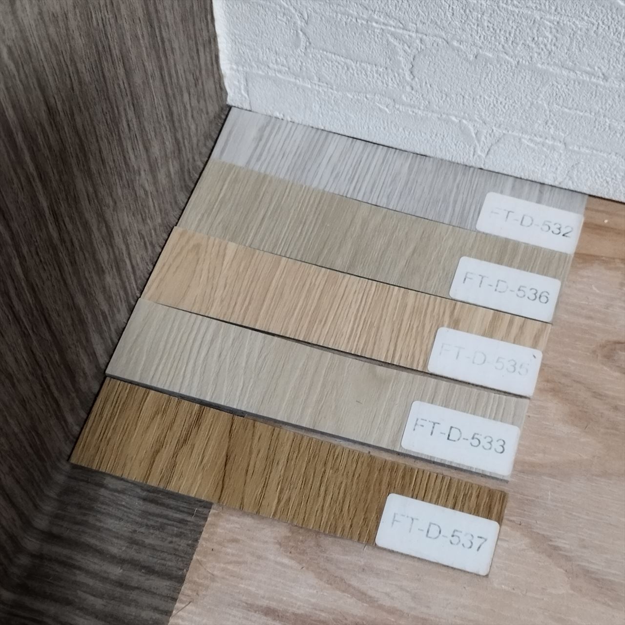 壁と床の境目には、フロアタイルの隙間などもできてしまうので、「巾木」と呼ばれる木もしくはアクリル製のものを取り付けていきます。