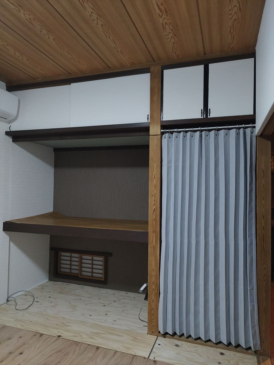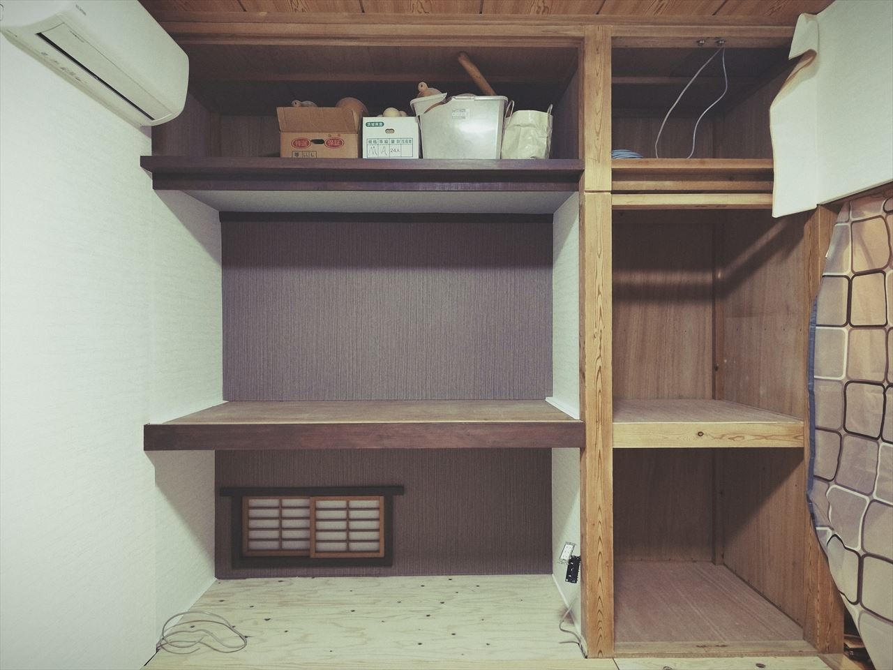 右側の細い押入れは、入口にカーテンをつけるのと、衣装ケースや棚などを設置するので壁と床はベニヤのまま。