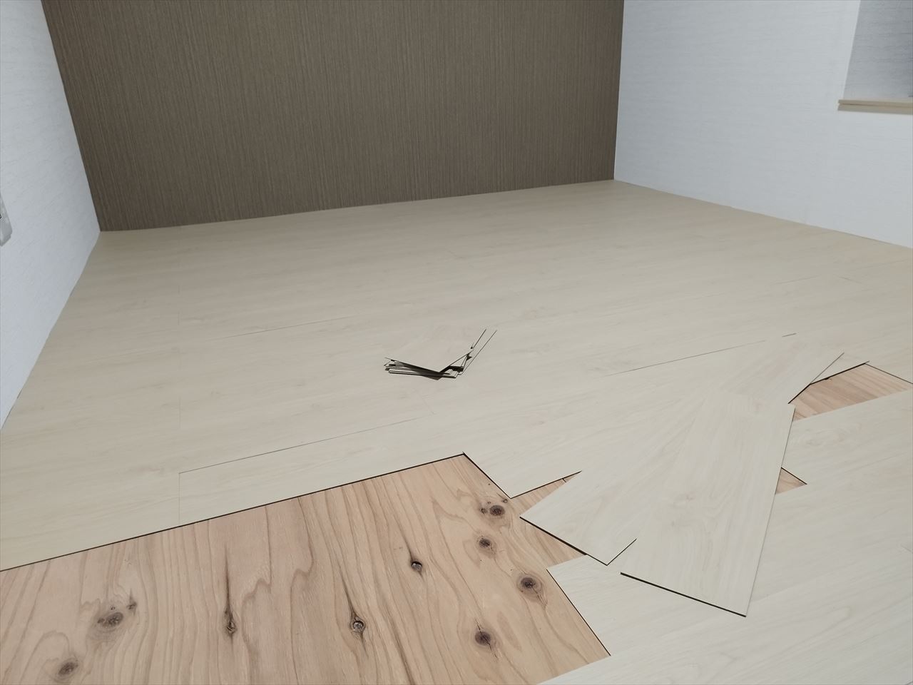 フロアタイルの特徴は、2mm程度と薄いので取扱いが楽で、カッターで切れること。最終的にはボンドを全面に塗って貼り付ける必要があるのですが、並べただけでも特に問題はないので、家具配置などを決めるまでは貼らずに使うことにしました。