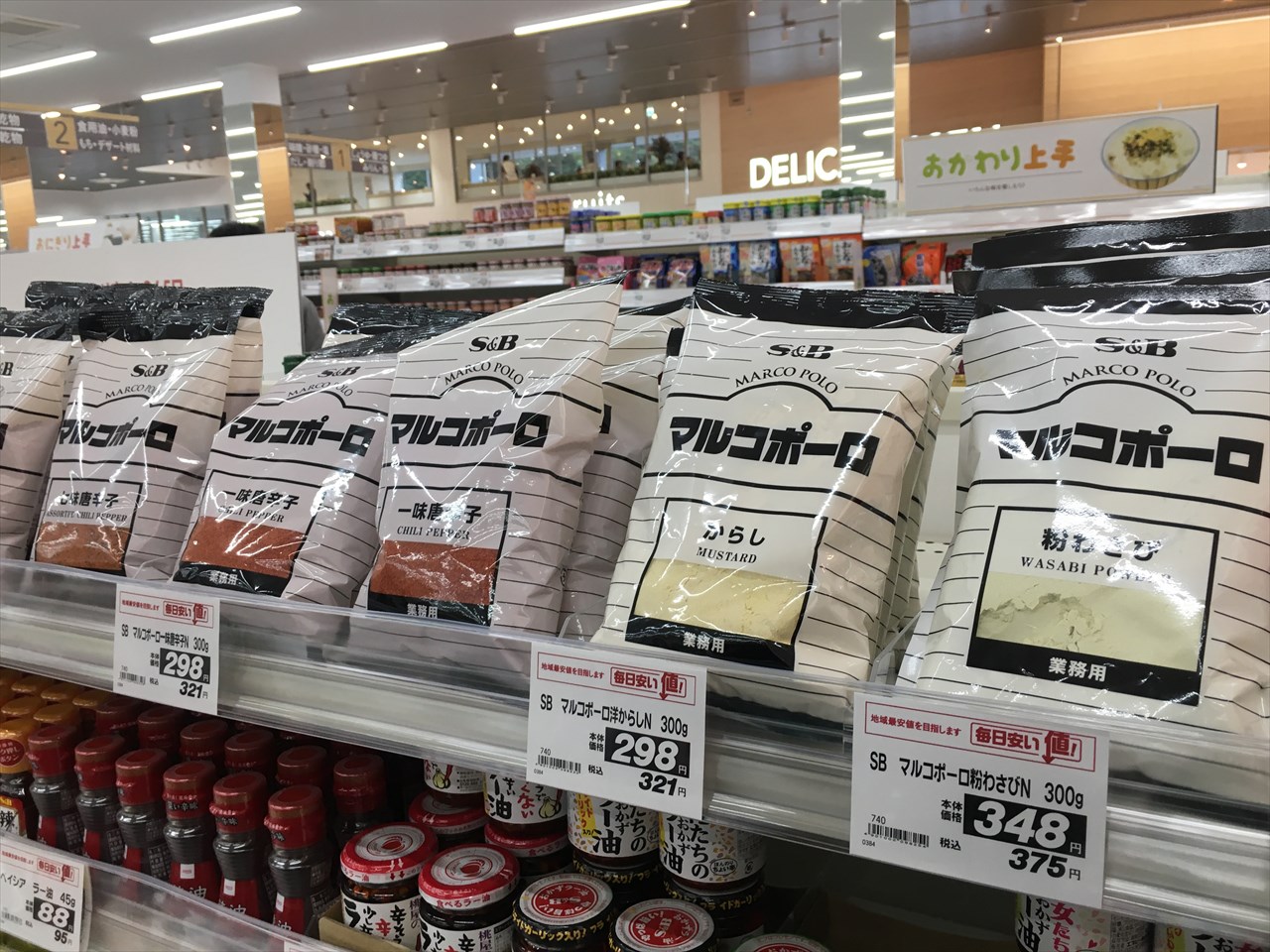 300g入りの粉ワサビや洋からし、さらに一味唐辛子などが売られていた。
