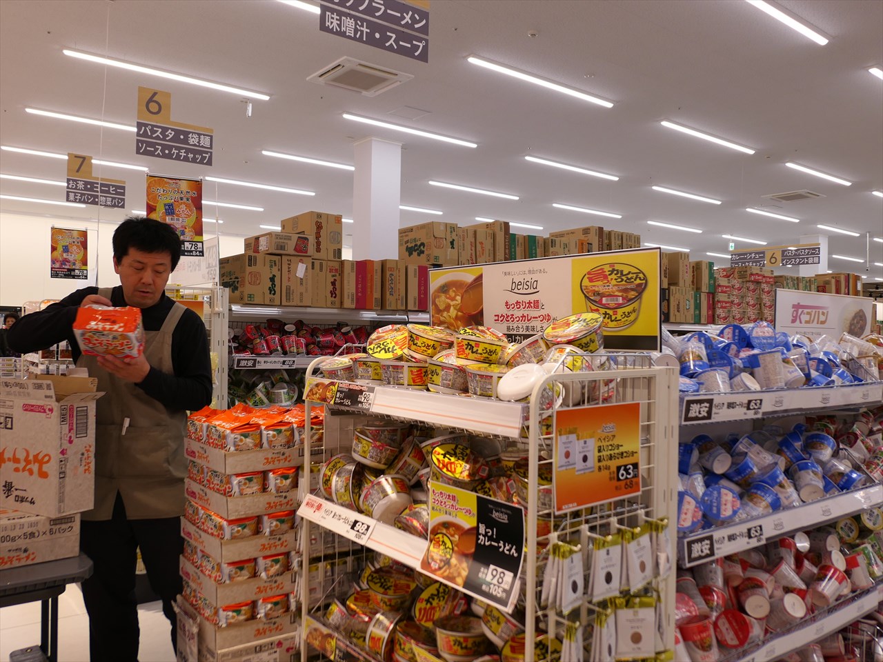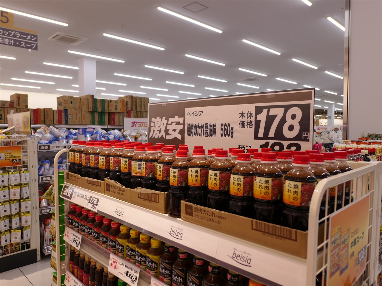 コーナーエンドには、一押しのベイシアPB商品が山積みになっている。