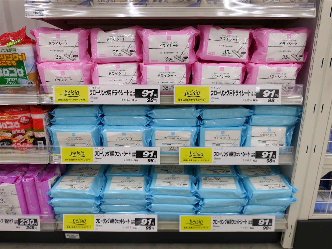 このドライシート・ウェットシートは、部屋ごとに置いておくとちょっと床掃除したい時にさっと使えて便利だ。ドライシートは35枚入りでウェットシートは20枚入りで税込98円。