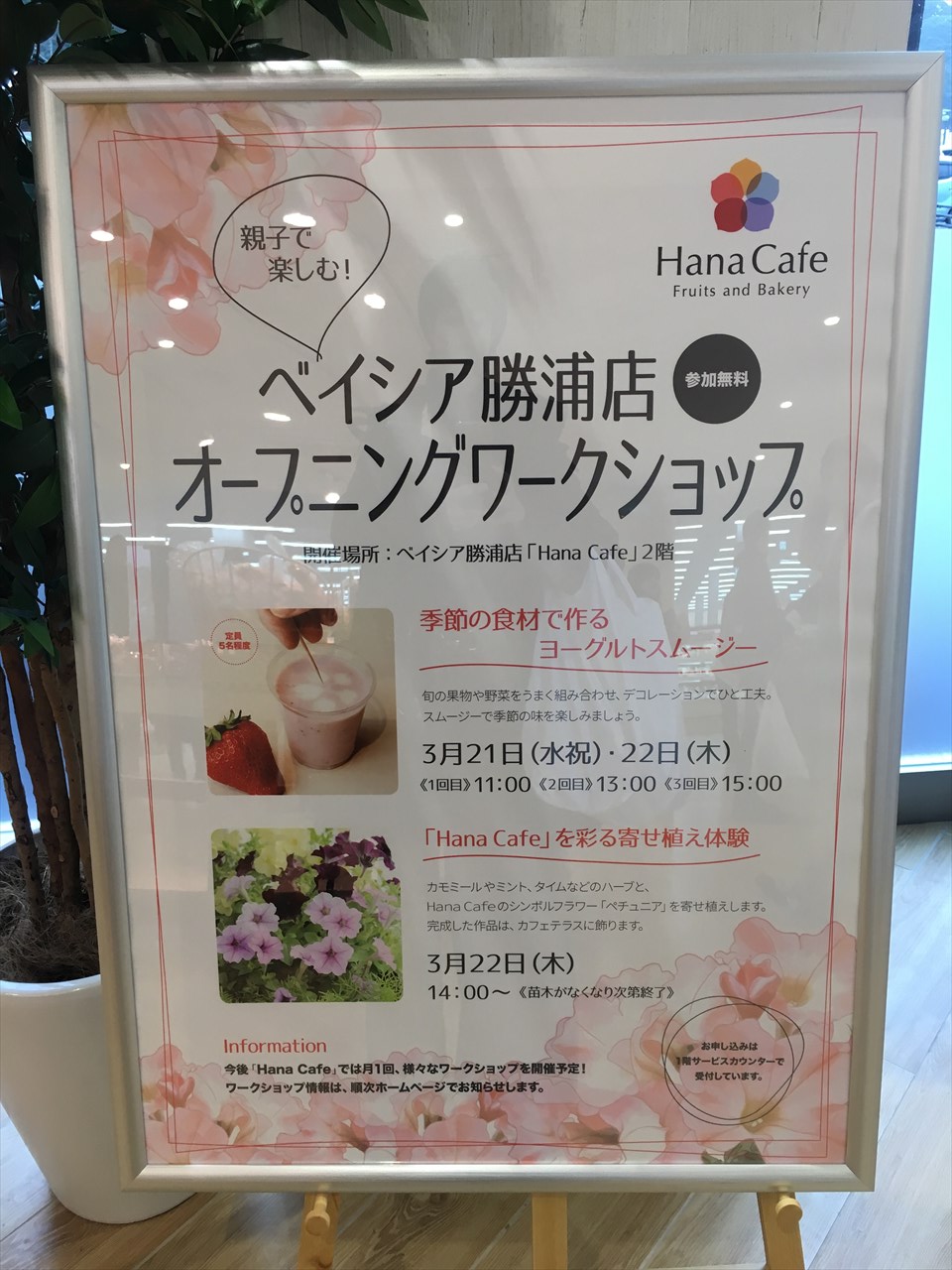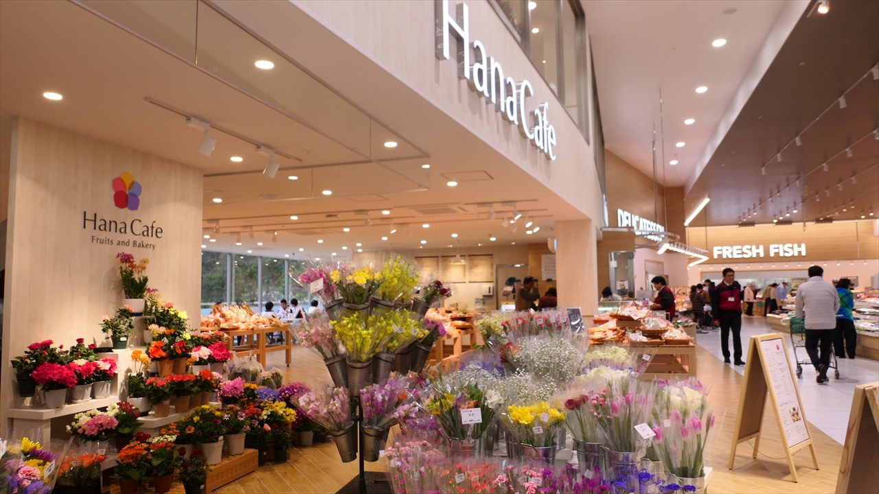ベイシア勝浦店では、既存店舗にはない新たな取組みもいろいろ行われているが、中でも最大の目玉が、正面入り口入ってすぐ左側にあるベーカリーカフェ「Hana Cafe」。