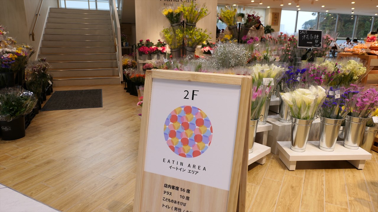 ちなみに青果売り場から二階のイートインコーナーを見るとこんな感じ。