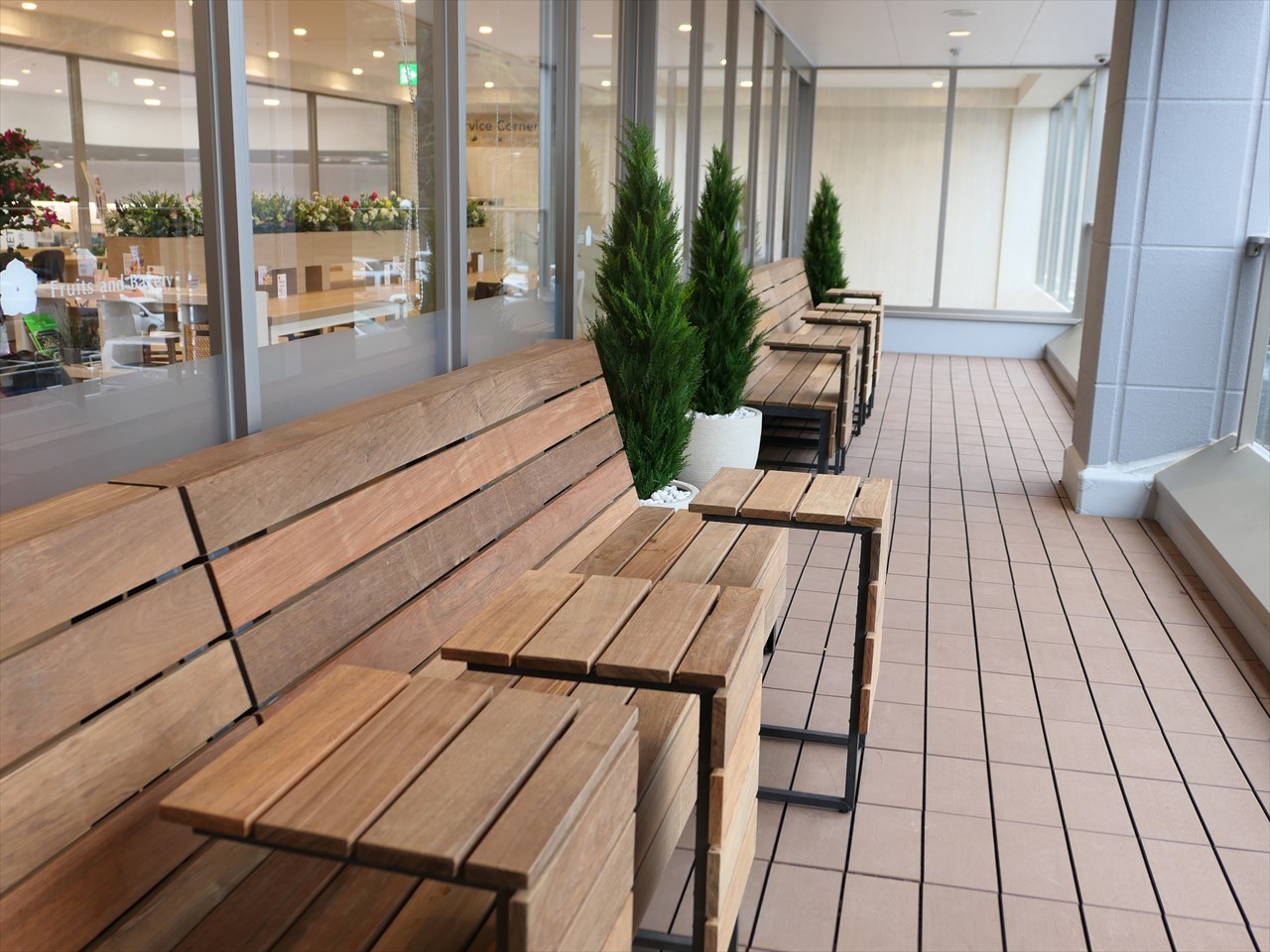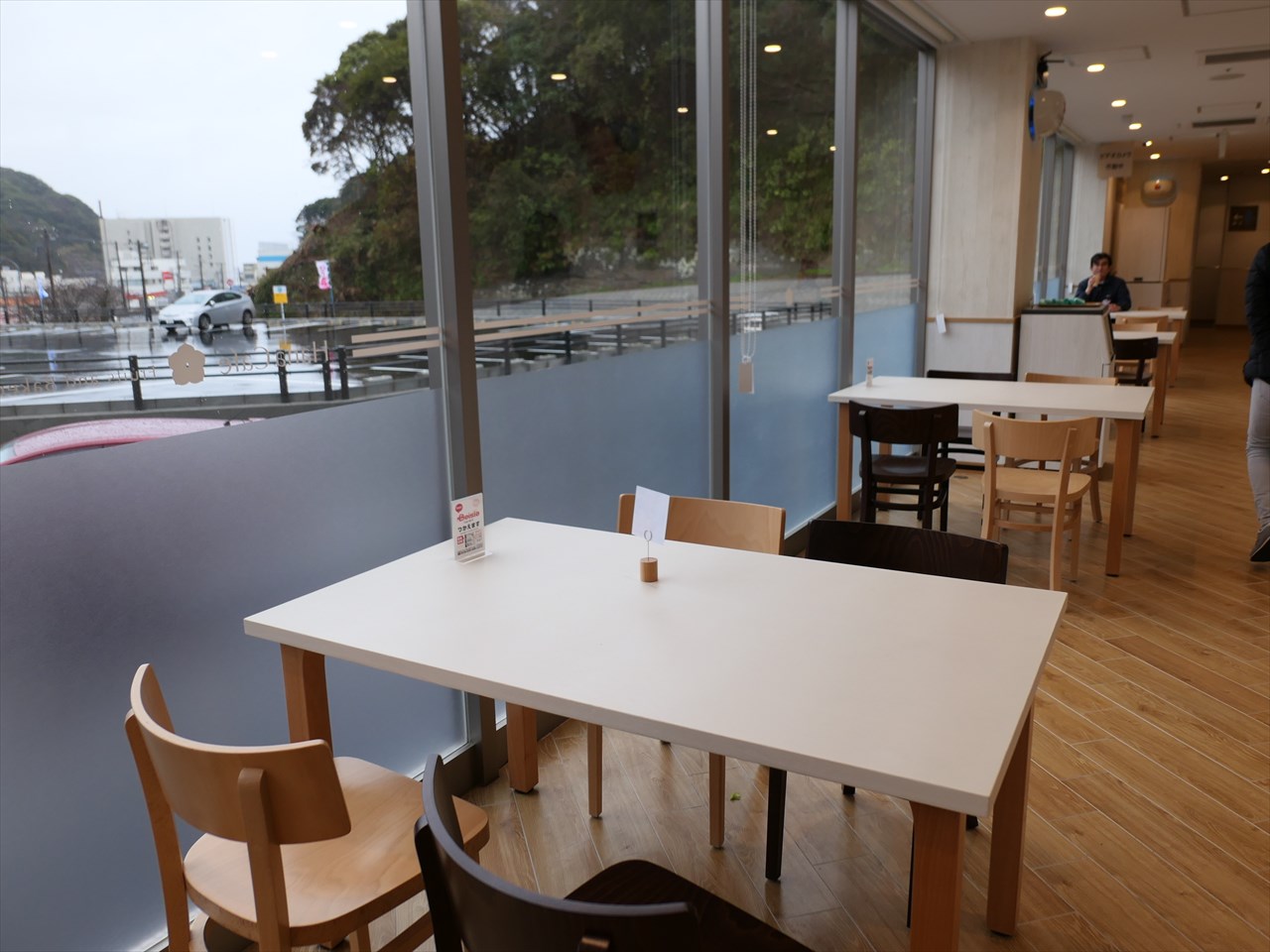 この日は雨天で利用者はいなかったが、木のベンチを並べたテラスも魅力的な空間。天気がよければ、海も眺めることができる。