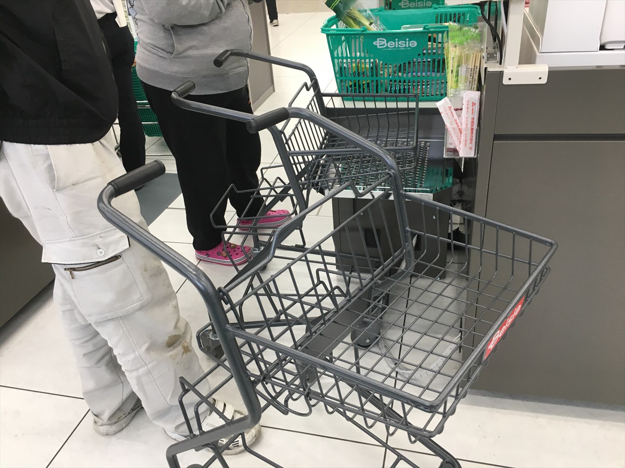 レジまわりにも、重たい買い物かごの上げ下ろしを減らす工夫が施されている。