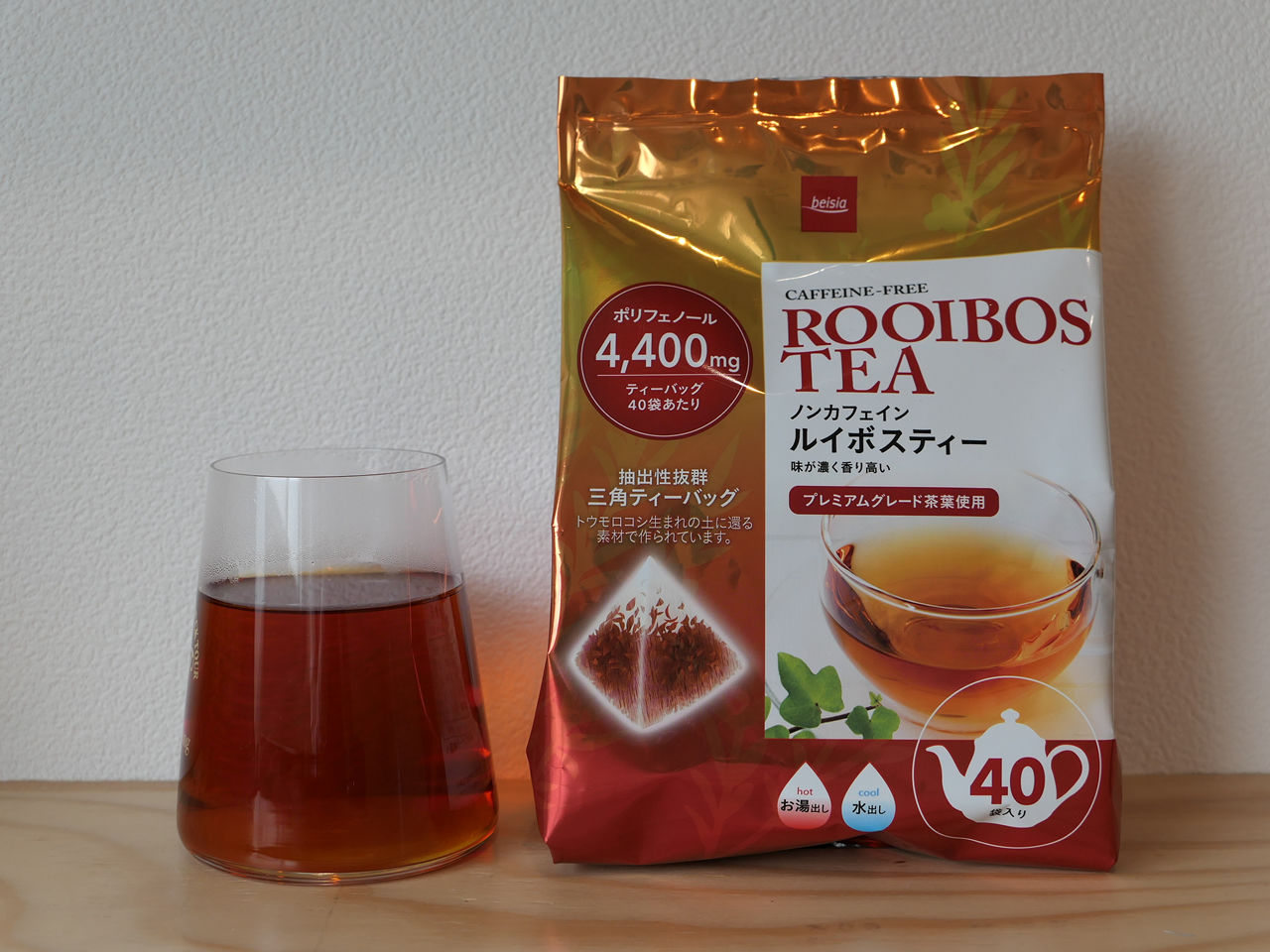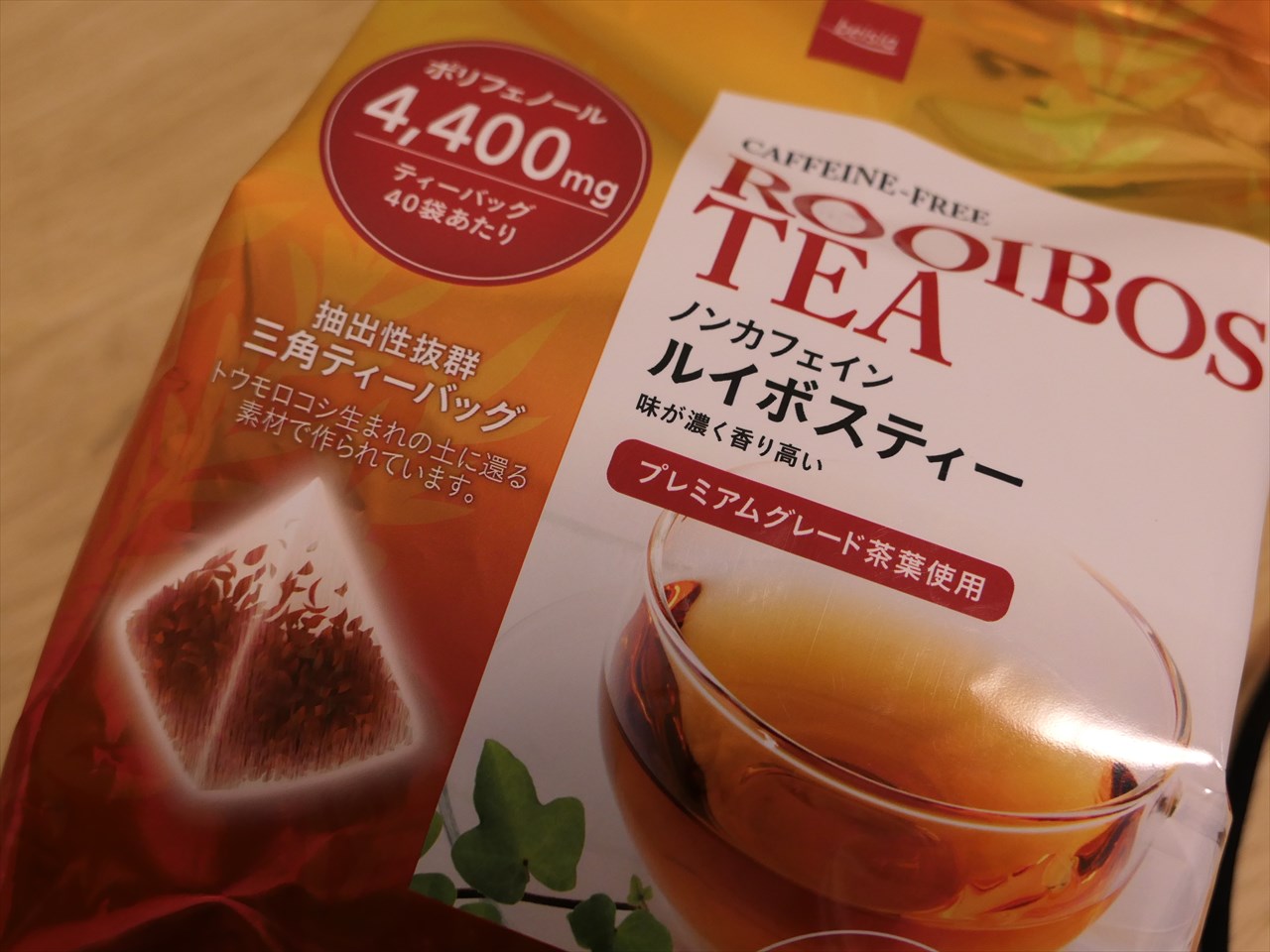 ベイシアのルイボスティーでは、ティーバッグ1個(1L=約3杯分)の中にポリフェノール110mgが含まれている。ポリフェノール含有量だけで見ると、珈琲や緑茶、赤ワインのほうが多いかもしれないが、ルイボスティーはなんといっても・・・
