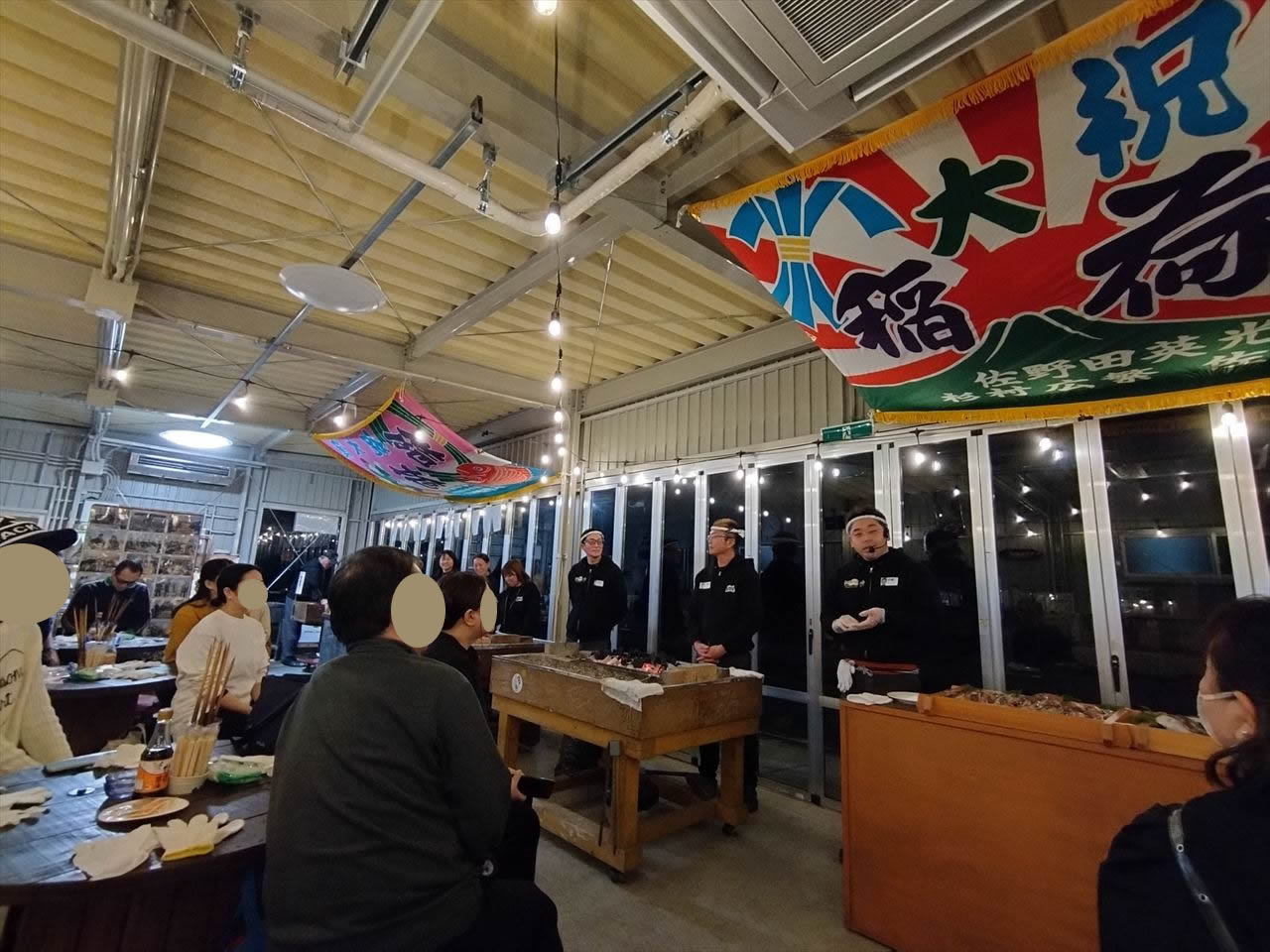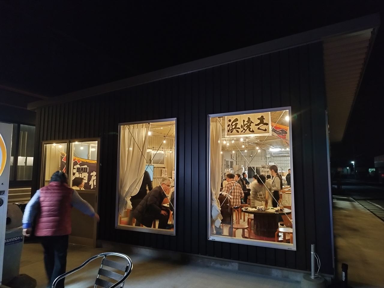 夜は、宿の前に作られた大きなプレハブ小屋で「浜焼き」体験。