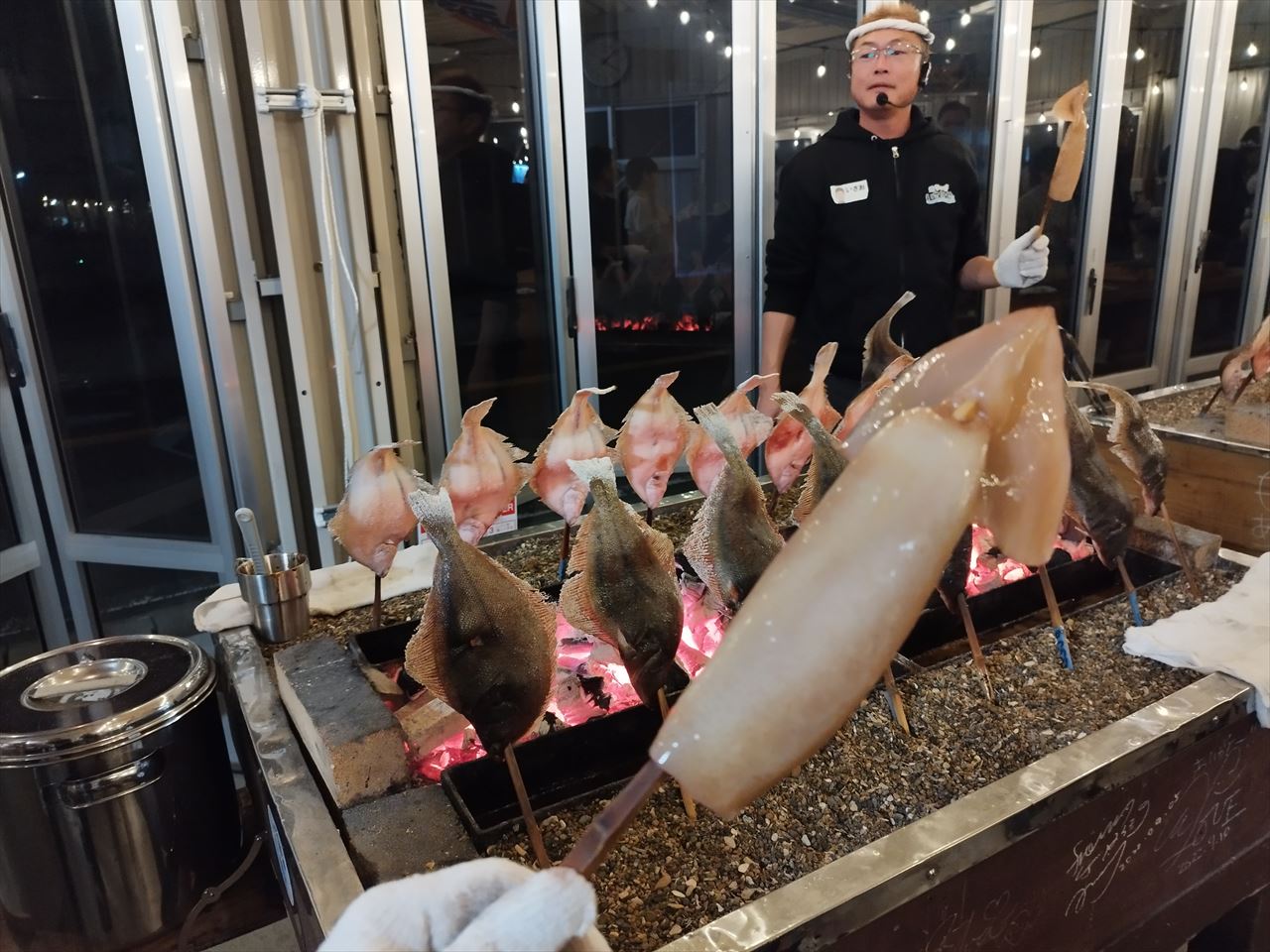 竹を割って作った特注の竹串に、ひとりひとり、カレイやイカを刺して、炭火で焼く。