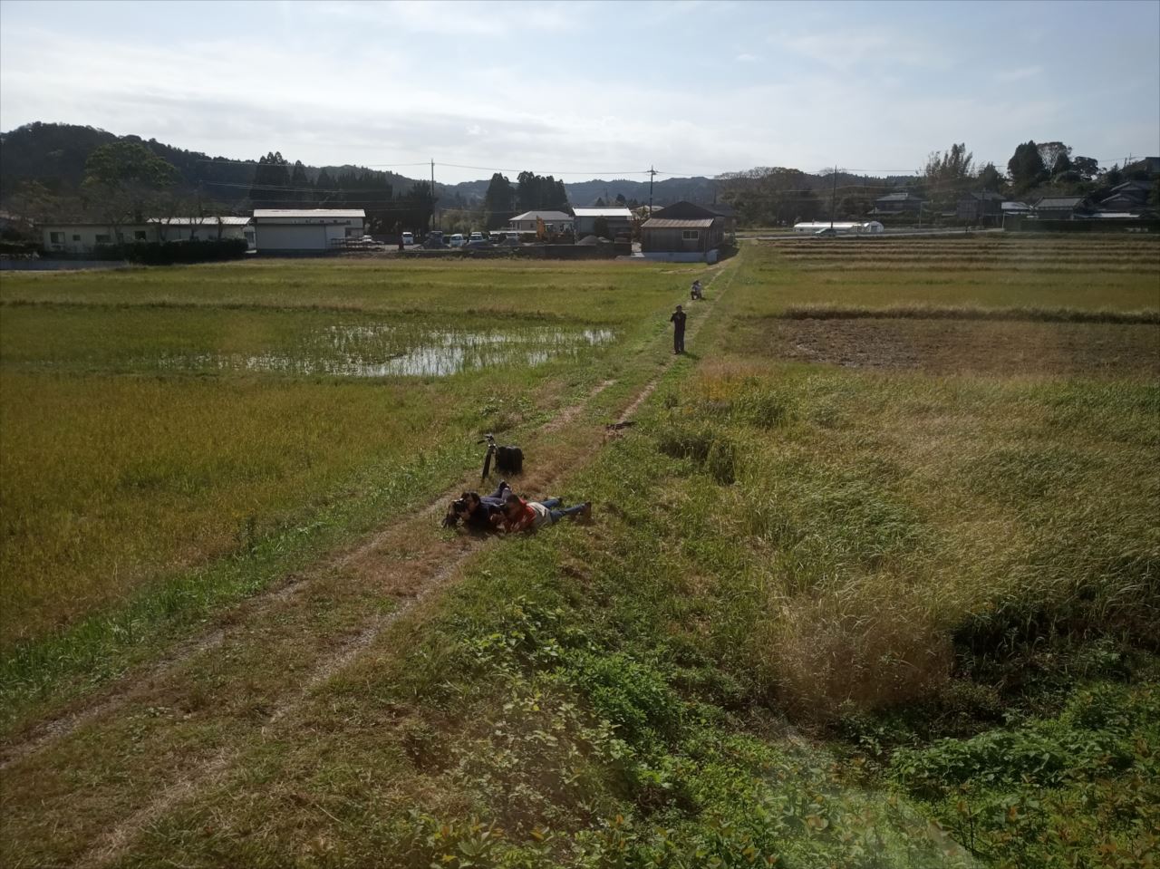 窓の外を見ると、田んぼのあぜ道などに三脚をたて、あるいは腹ばいになって、秋ののどかな里山風景の中を走る車両を撮ろうと、たくさんの鉄道ファンがカメラを構えていた。
