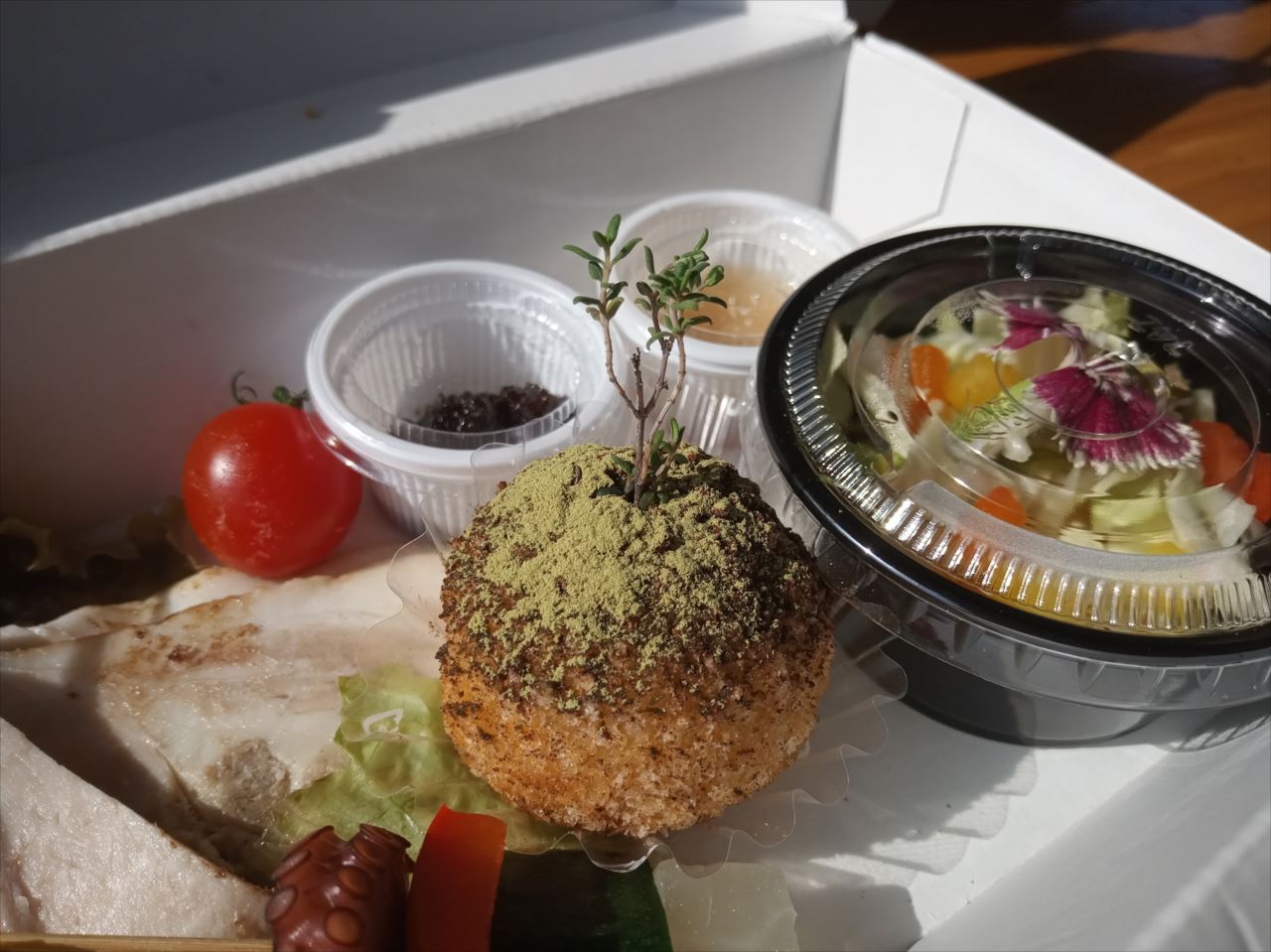 最高にキュートで、最後まで食べるのがもったいなくて残してしまったのが「苔玉コロッケ」。上に乗っているのはハーブ。