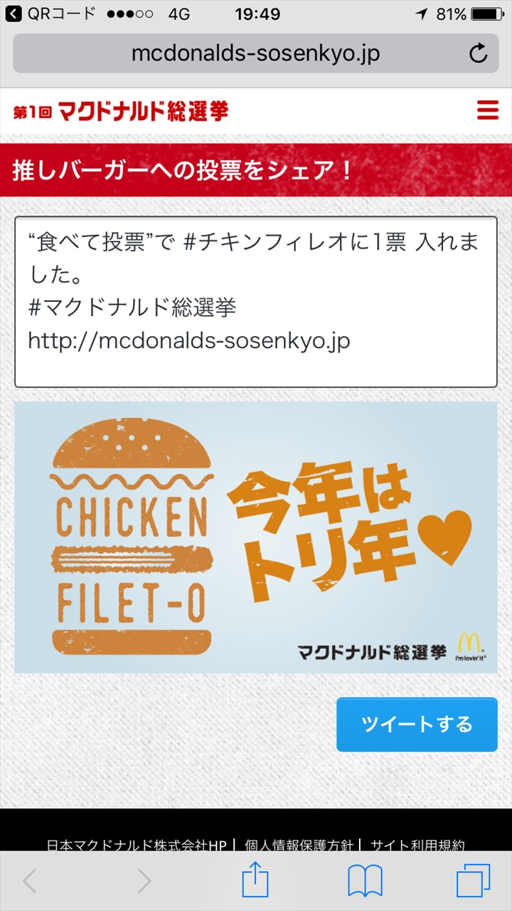 無事投票を終え、チキンフィレオファンとしての国民の義務も果たしたので、安心していただくことに。