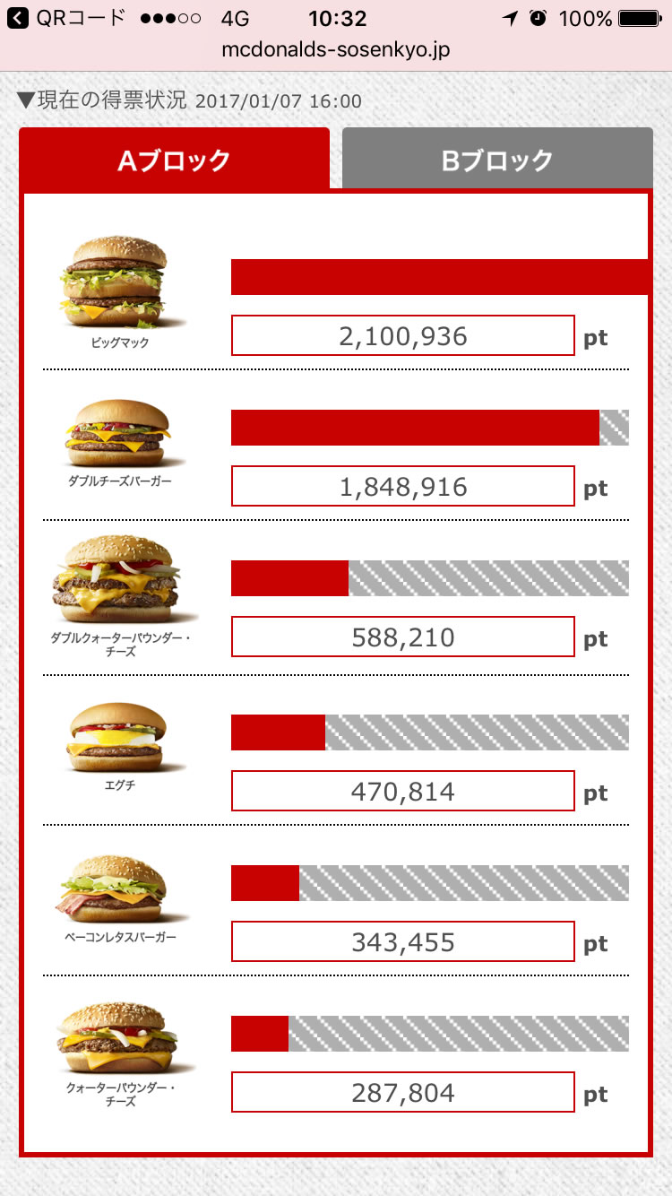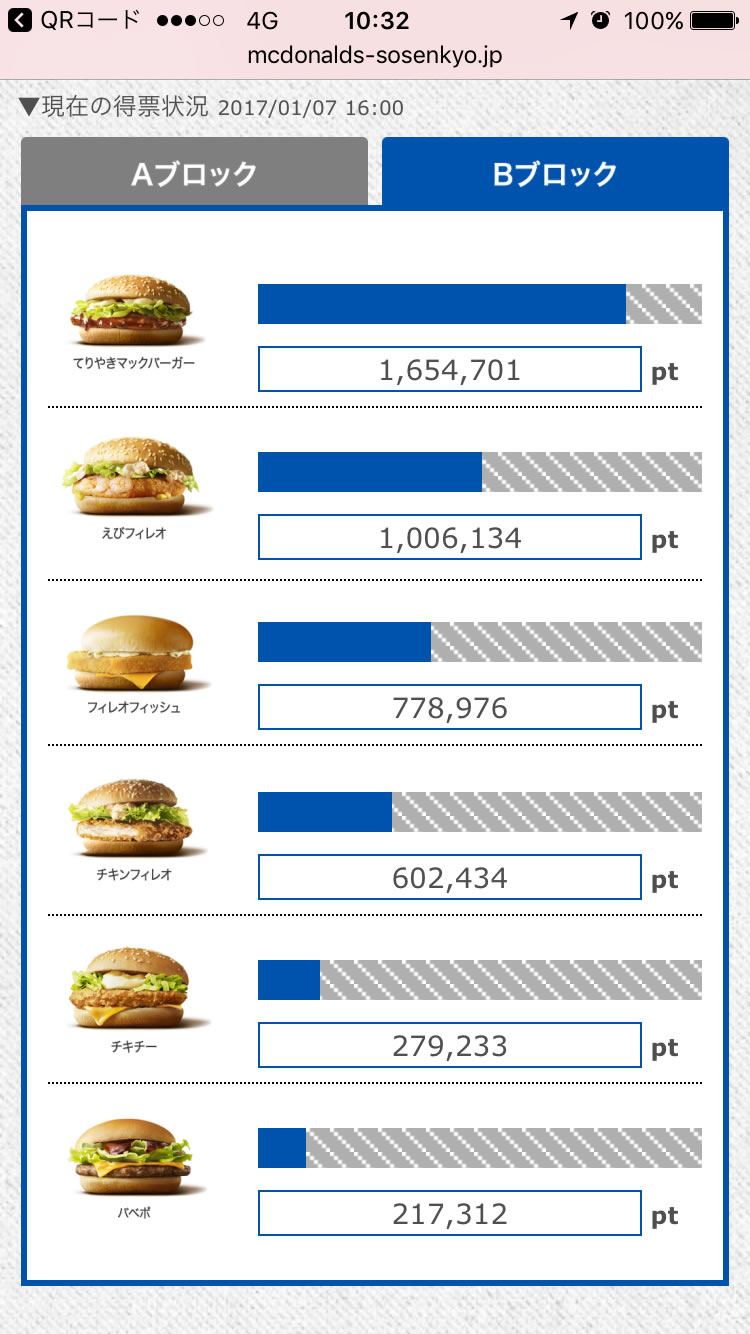 Aブロックでは「ビッグマック」「ダブルチーズバーガー」が3位以下を大きく引き離してデッドヒート。それと比べるとBブロックの差は小さいものの、私の推しバーガー「チキンフィレオ」はまさかの4位。もしや「チキチー」とカーニバッてしまっているのかもしれない。