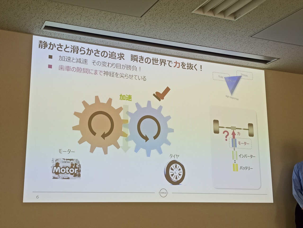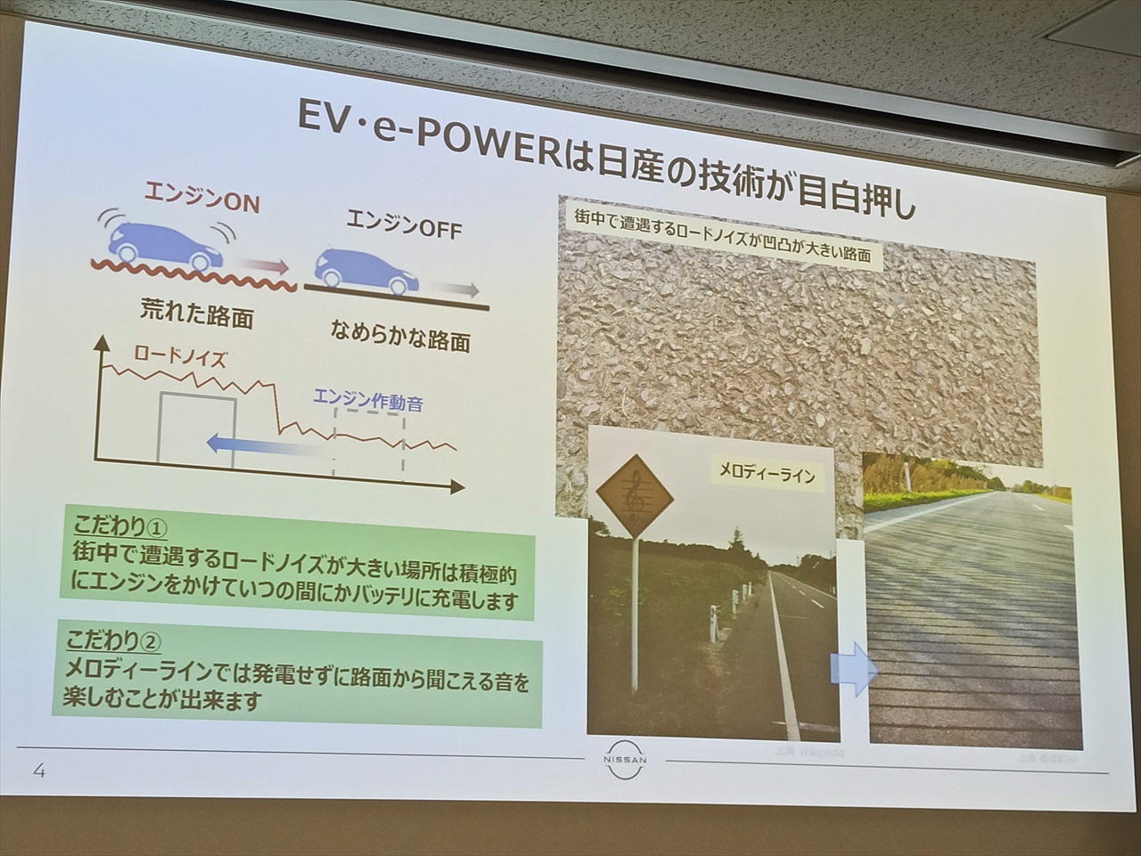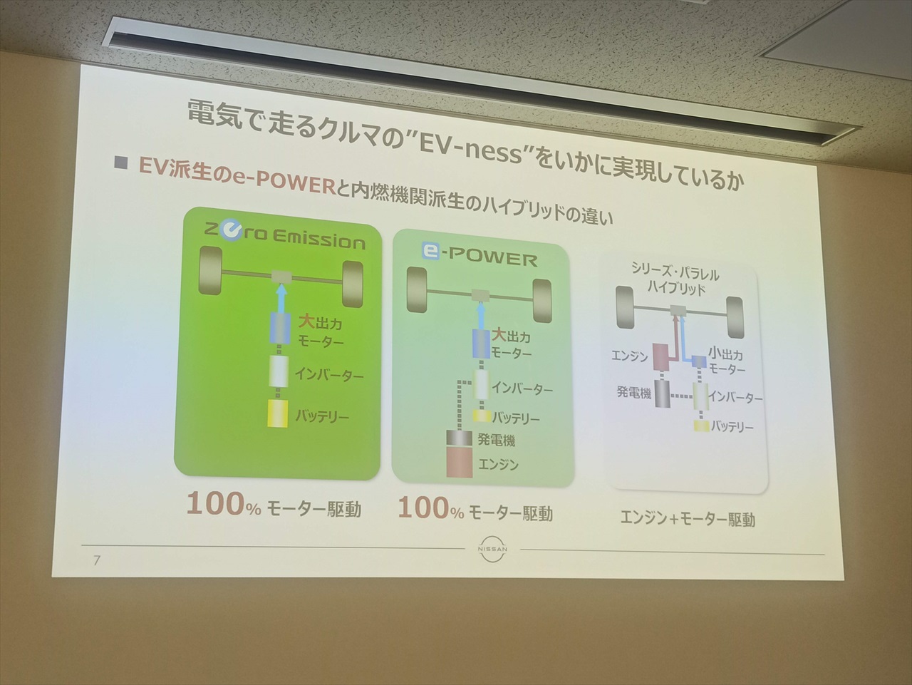 会議室では、どんな先端技術が搭載されているのかや、日産が目指すEVの話などもあった。