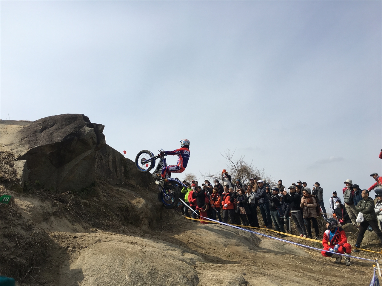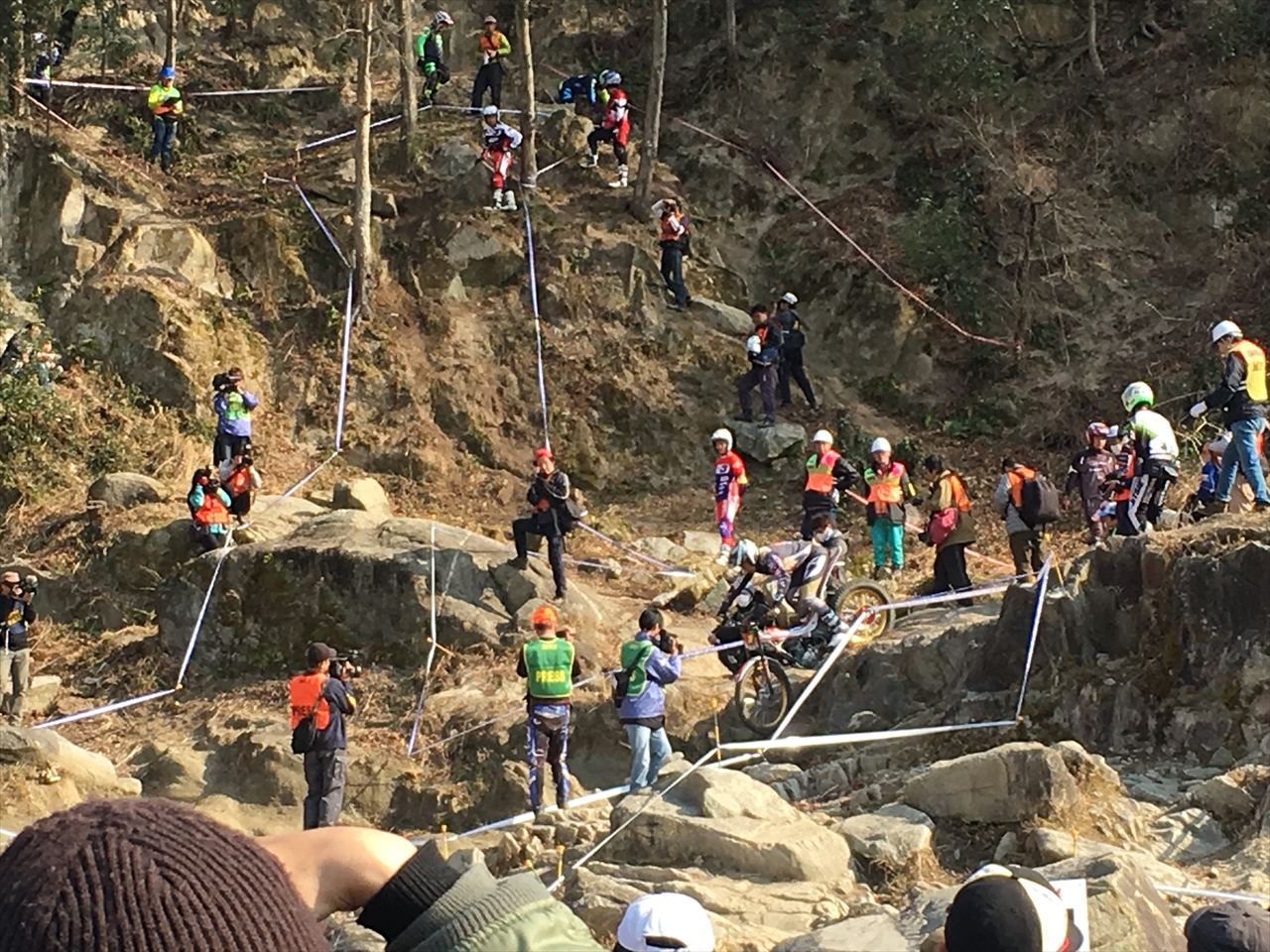 セクション内以外は基本的にどこで観戦してもよく、下から見上げる人もいれば、岩をよじ登って真横や上から観戦する人も。観戦客エリアとコースの間はビニールテープで仕切られているだけなので、バイクが突っ込んできたり落ちてきたりする危険性もあるが、そこは見ている人の自己責任なのだろう。