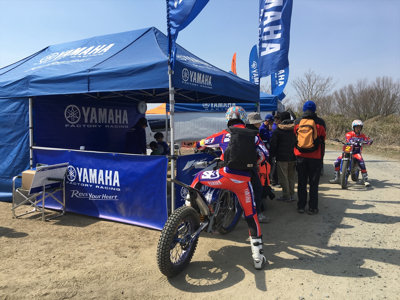自分は見渡す限り広大な平地の茨城南部(波崎)で育ったが、筑波山を越えてこの辺りまで来ると、こんもりした山が至る所に。石切り場だったのかなというそんな山林の一角がトライアルの会場となる。常設の施設ではないそうで、受付もこんな場所。サーキット的な建物もあるのかと思っていた自分の予想とは全然違った。
