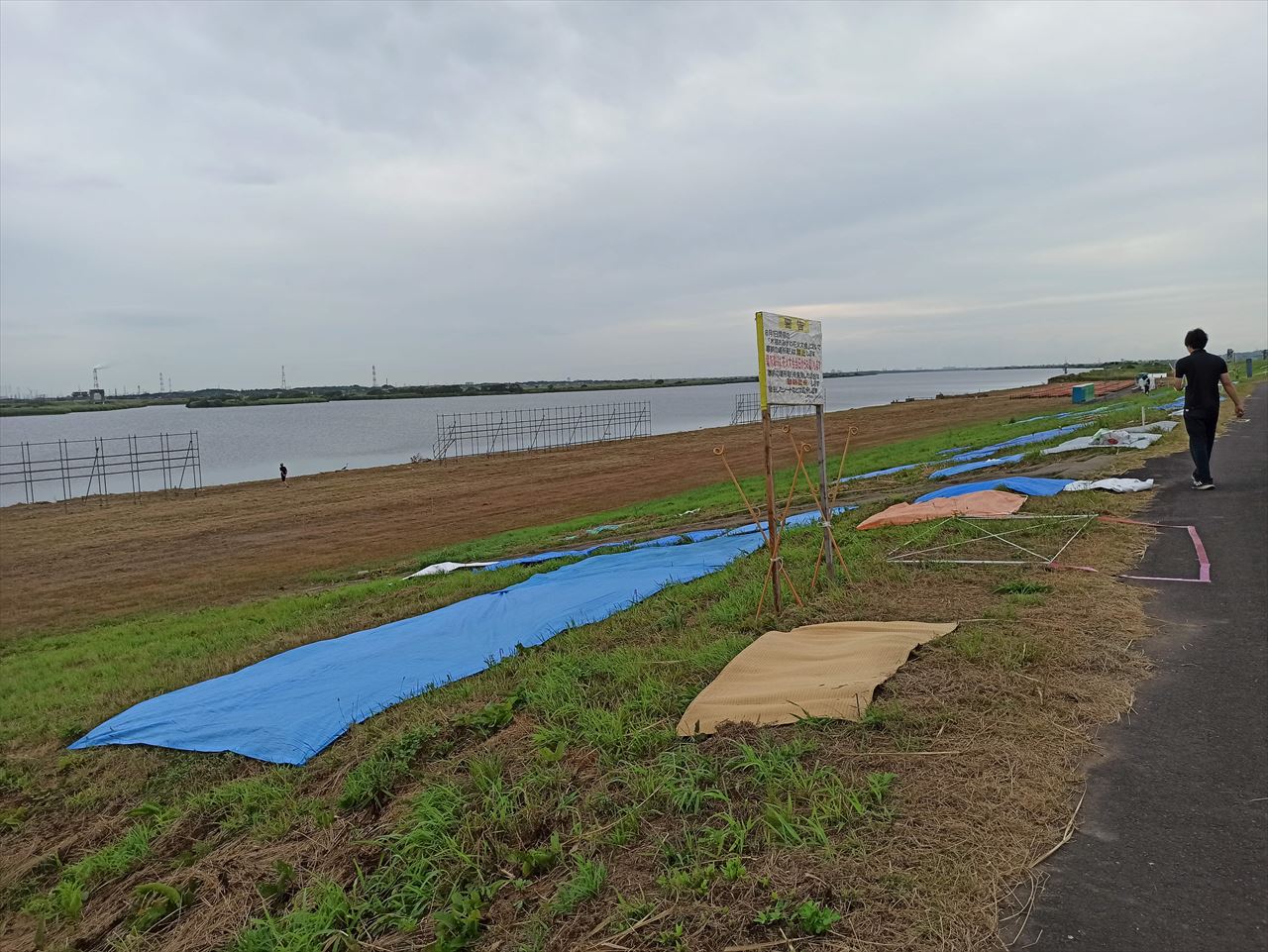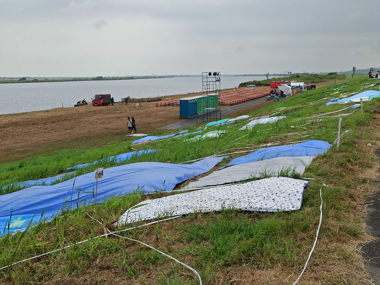 堤防の手前には、何台もの車が路駐されており、堤防を上がってみるとブルーシートを張る人たちの姿があった。