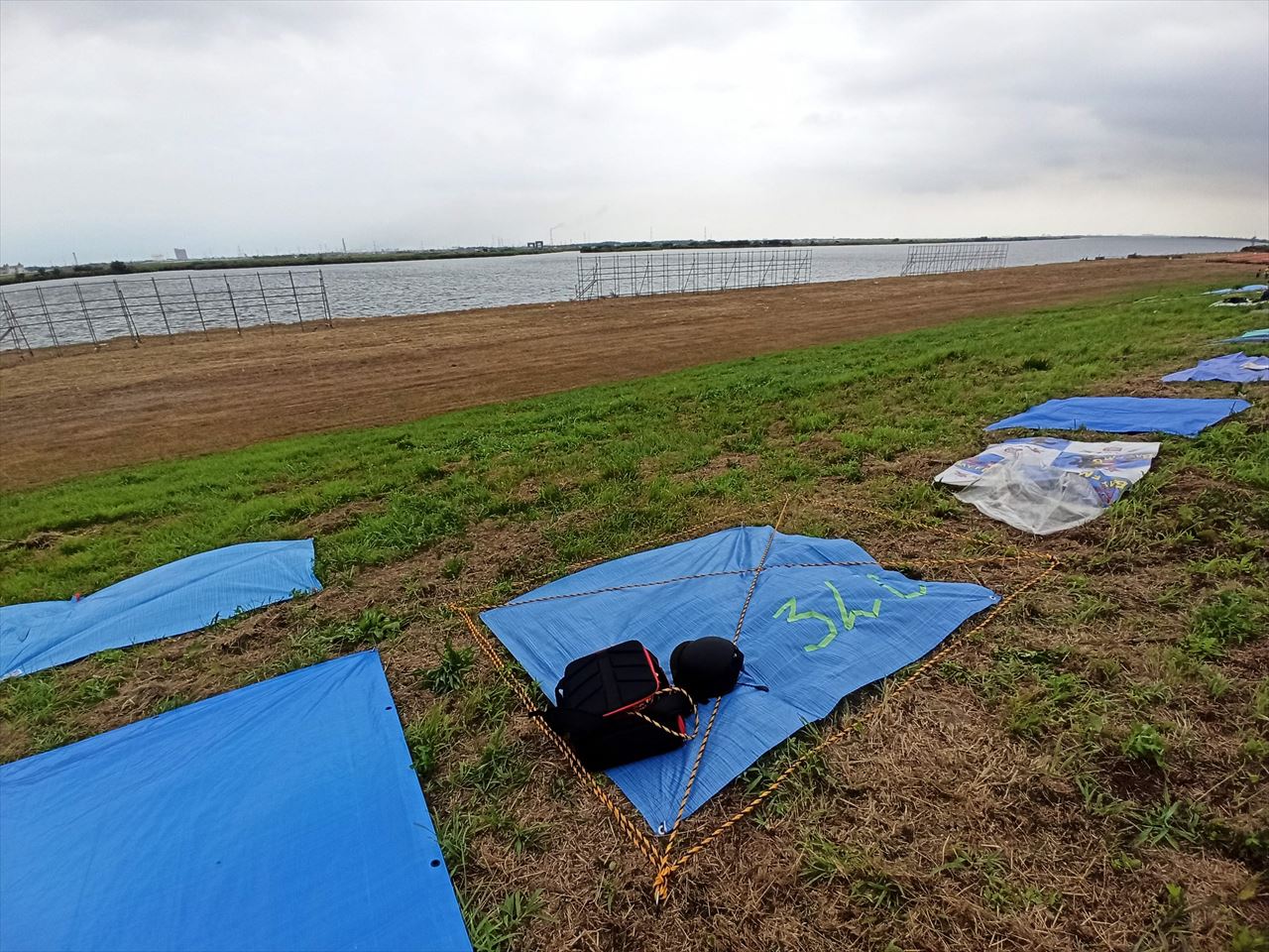 真正面エリアでも十分に張れたんだけど、自分たちが実際に会場に来るのは、花火が始まる30分くらい前で、その頃まで一等地で無人だと他のグループに乗っ取られちゃう可能性もあるかなという懸念があり、ちょっと斜め位置に場所取りした。このあたりはほとんどブルーシートもなく、乗っ取ってまで座りたい場所でもないかなと思い。