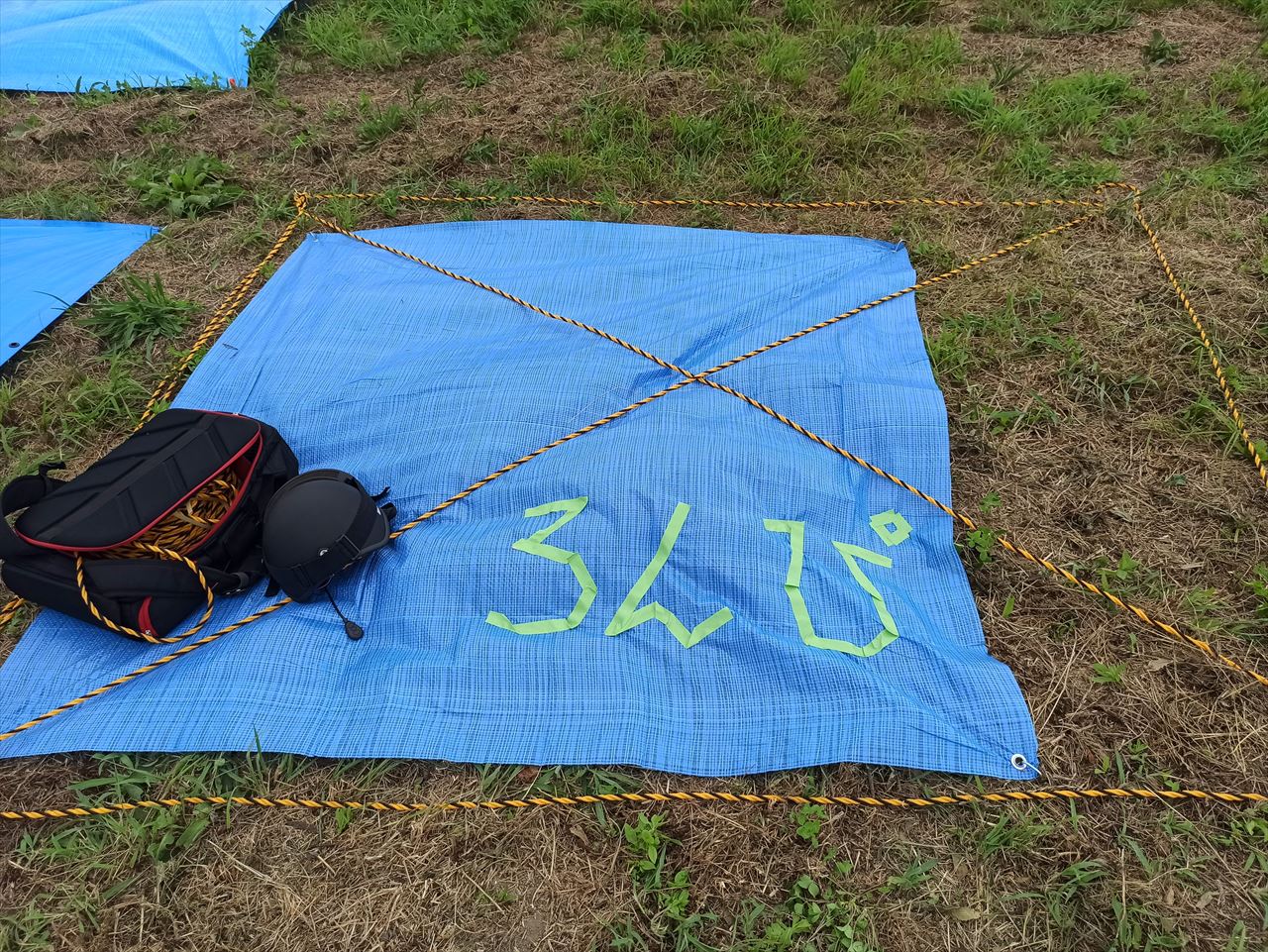 4人なのでブルーシートサイズでちょうどいいんだけど、真横にぴたり他のグループが来ちゃってもなんなので、トラロープを使ってちょっとだけ緩衝ゾーンを設けさせてもらった。靴を置いたりクーラーボックスを置くのにも必要だったので。