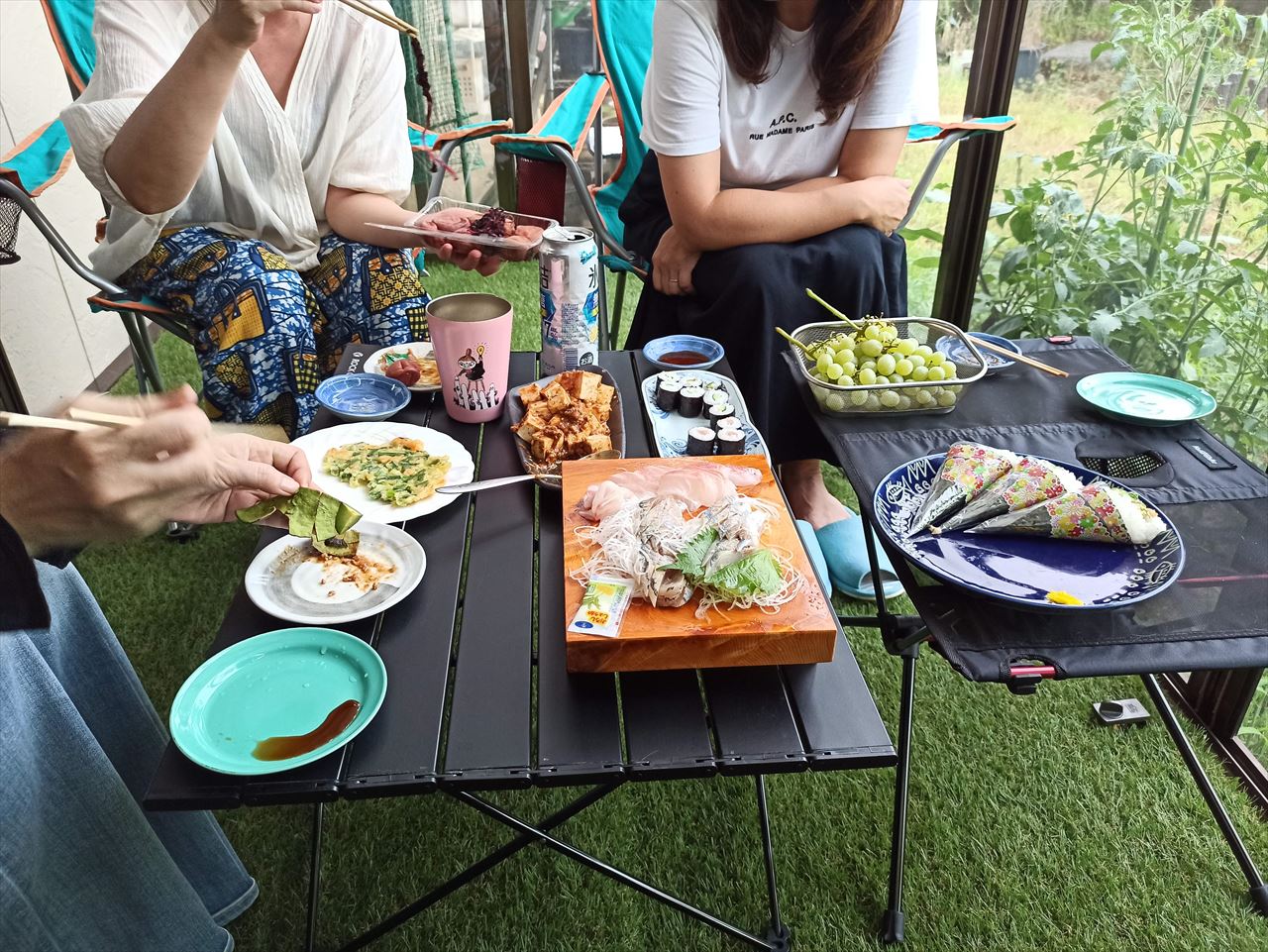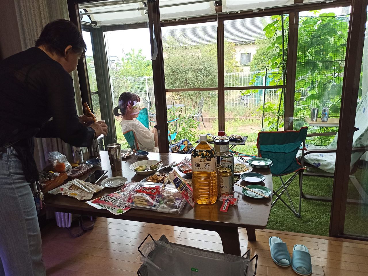 サンルームにキャンプ用のテーブルと椅子を並べてプレ宴会。