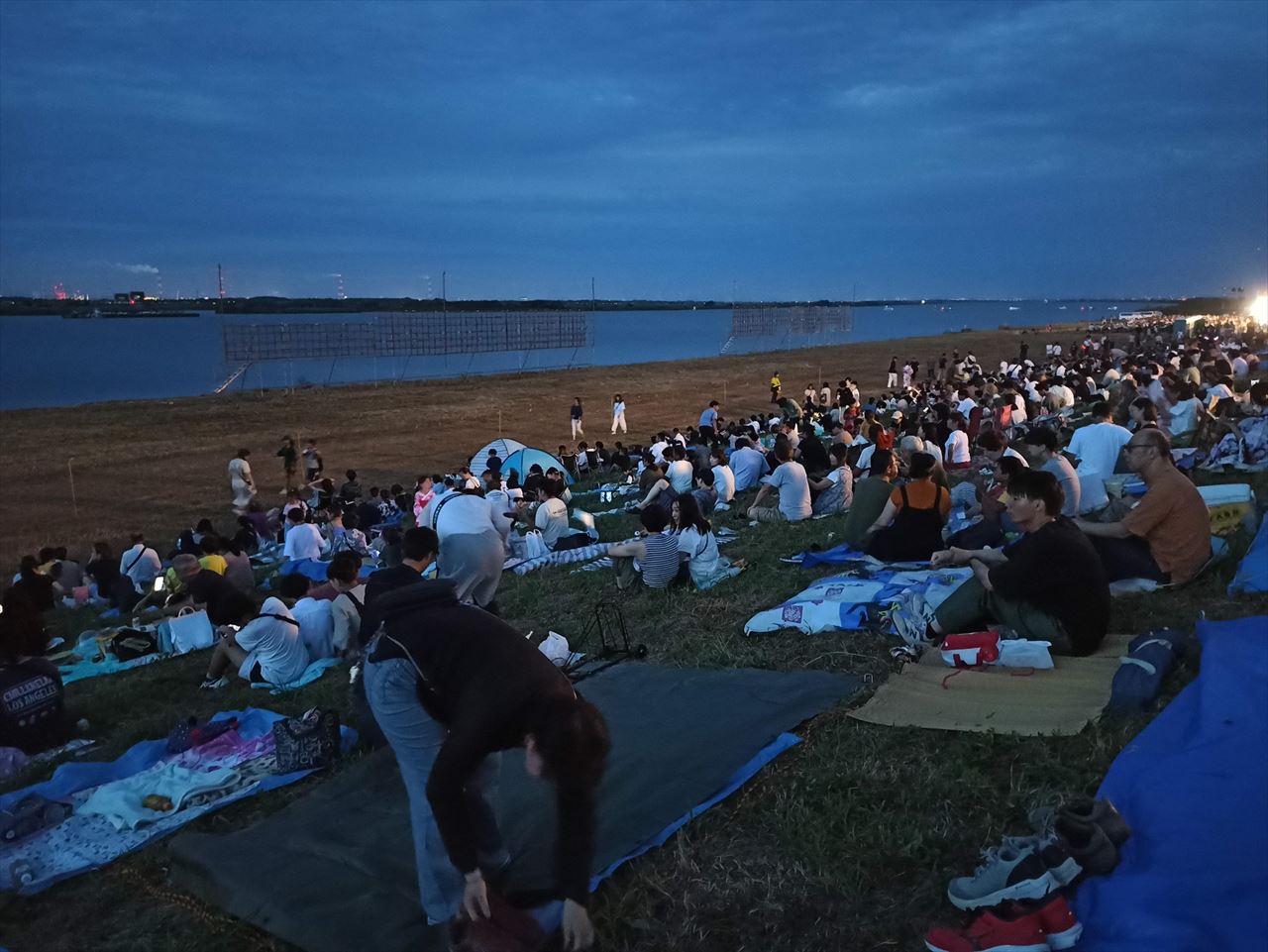 ここは、奥に仕掛け花火の足場が3セットあることでもわかるように、花火打ち上げ場所の真正面のメイン会場。それでもブルーシート占有率は半分に達しないくらいで思ったよりスカスカ。