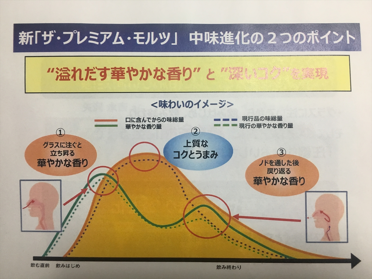 その後、現行のプレモルも飲ませてもらったのだが、比べると、現行のほうがやはり「おとなしい」印象になる。やはり新しいほうが「華やか」ということなのだろう。