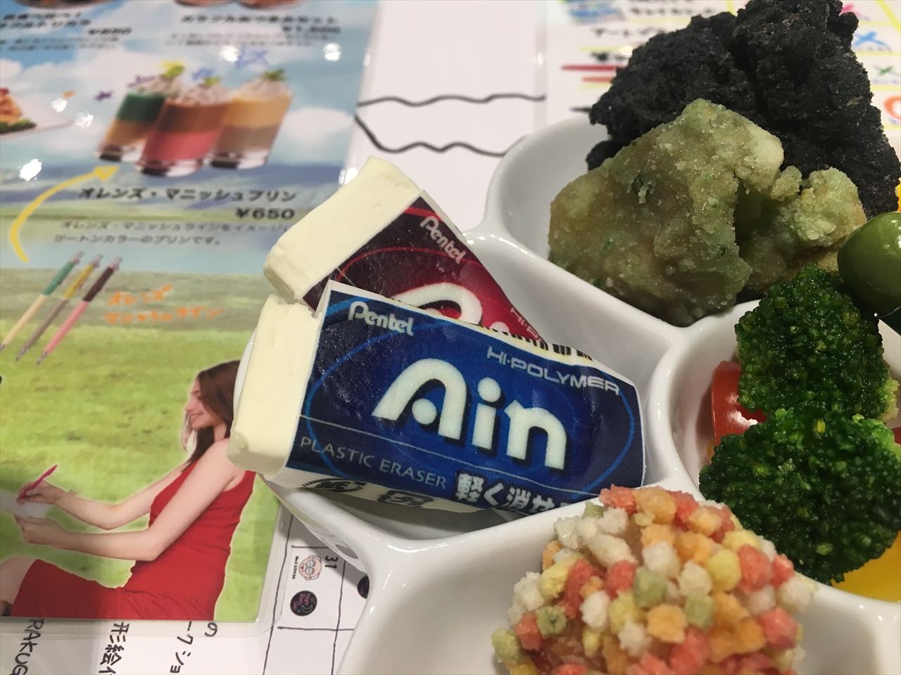 くれよんチョコの包み紙だけは食べられないが、消しゴムのカバーは食べられるインクで印刷したもので、全部食べられる。中身はチーズだ。