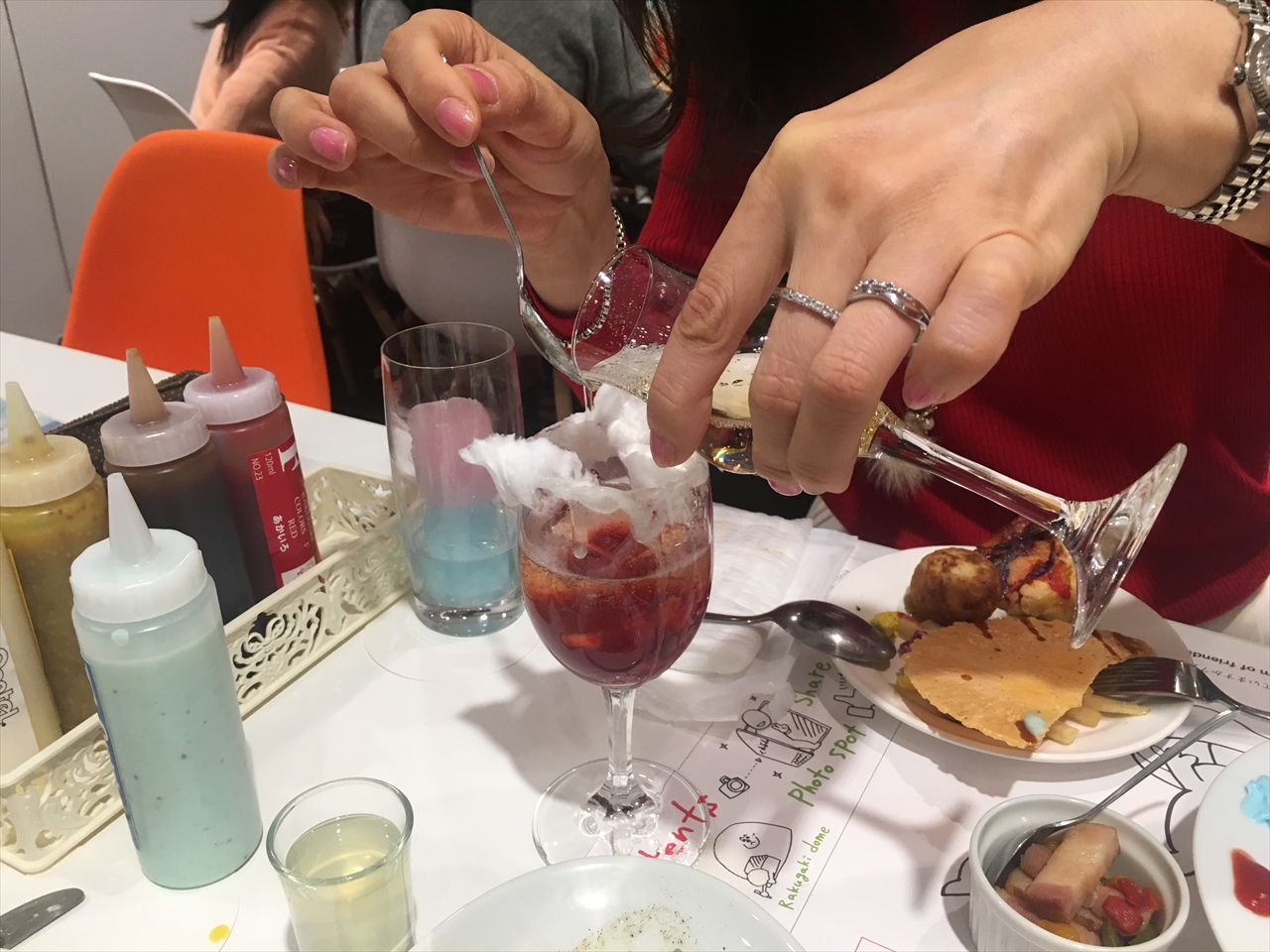黄金色に輝くジンジャーエールが小さなグラスに入って出てきて、それを自分でわたあめの上にかける。