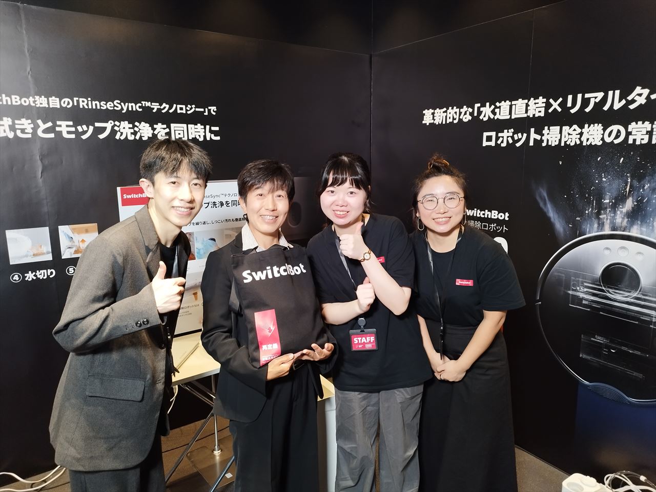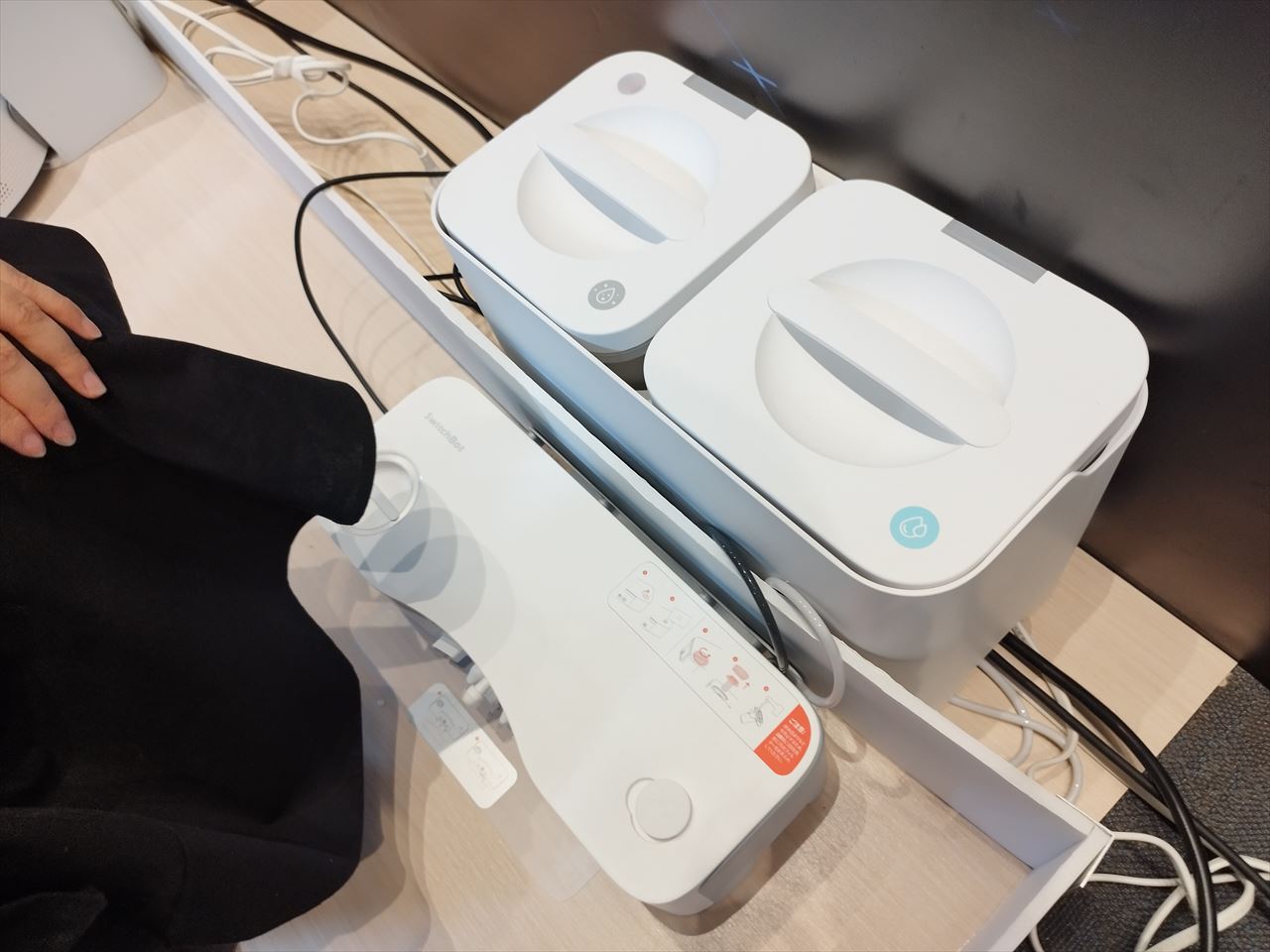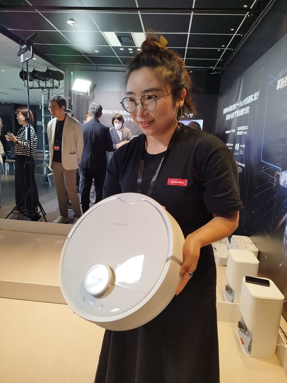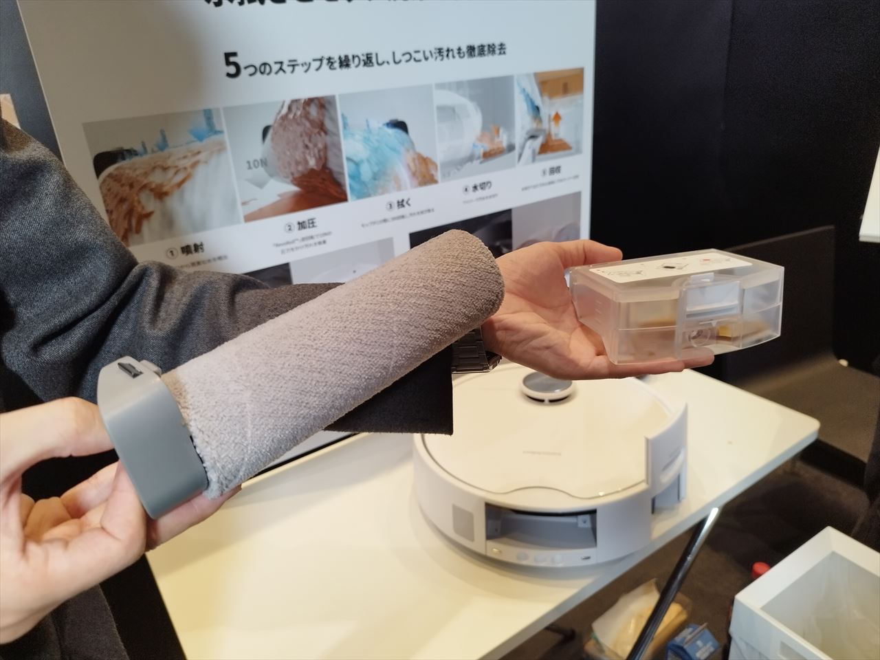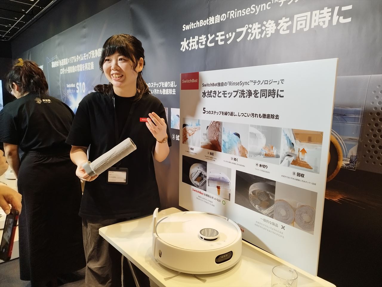 水拭きのためのローラーが、掃除をしながら同時に洗浄されていく様子を体感できるデモも行われた。実演してくれたのは、SwitchBotのSNSを運用する日本語が超流暢でキュートなスタッフ。SwitchBot愛用者のSNS投稿を精力的にリツイート(今はXだけど)するなどして、ユーザ間の交流も盛り上げてくれている方だ。