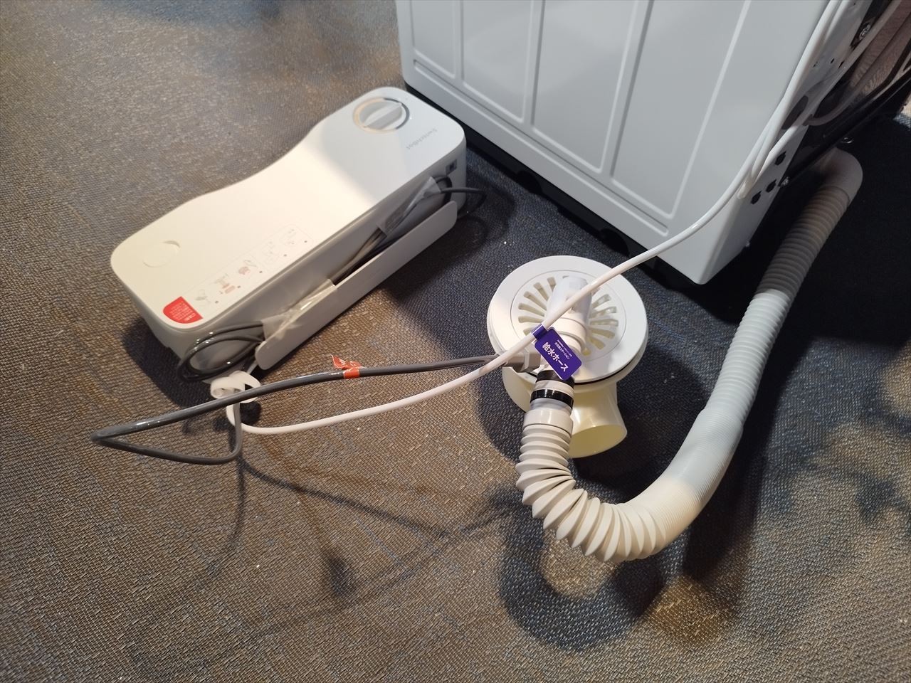 同じく、洗濯機の排水ホースと、排水口への差し込みパーツの間にアダプタを挿入するだけ。「水交換ステーション」へのホースはご覧の通り電源ケーブルくらいの細さでかつ長さも結構あるので、洗濯機のすぐ脇にスペースがない場合でも、洗面所のどこか空いている場所に設置することができる。