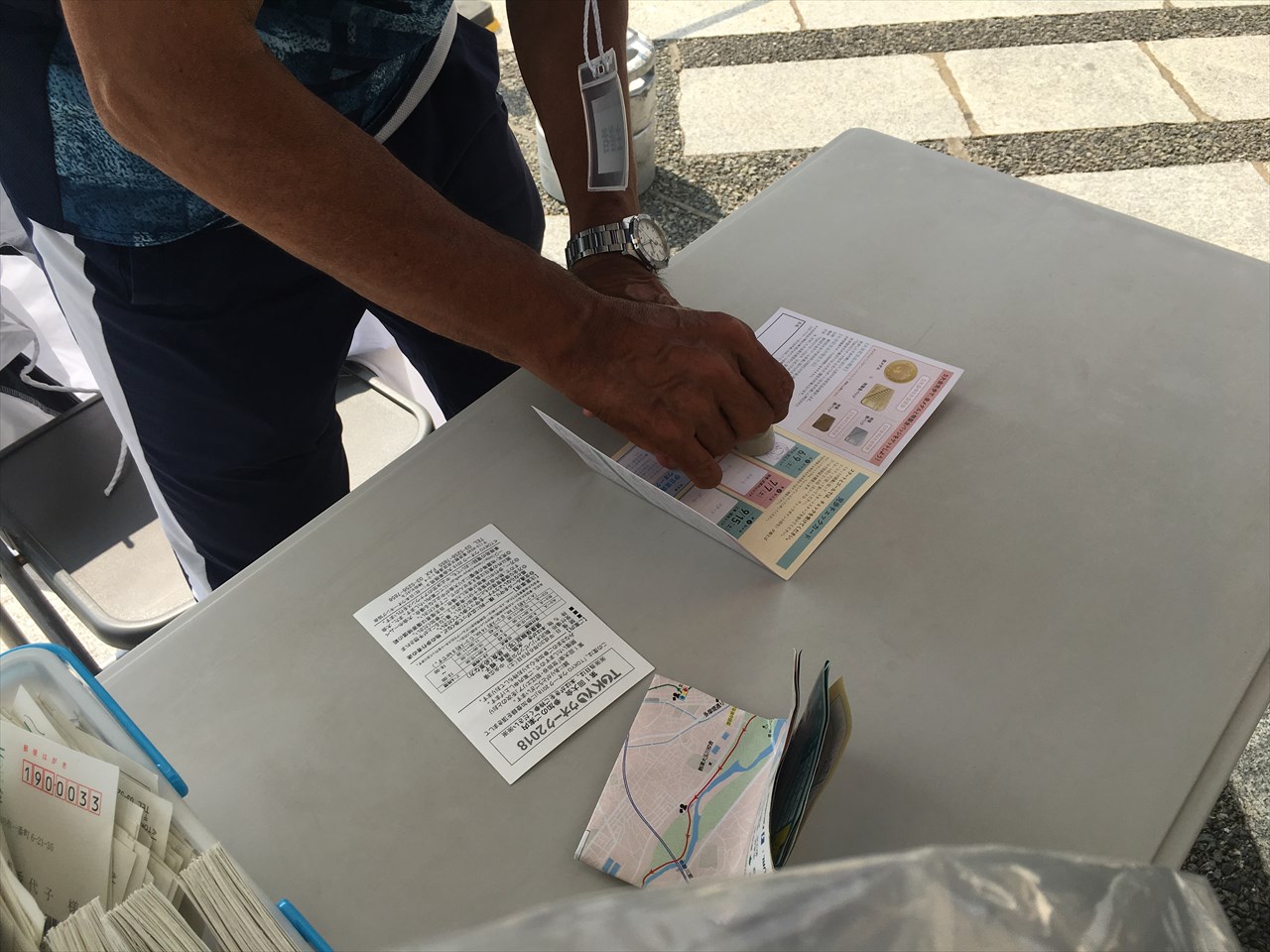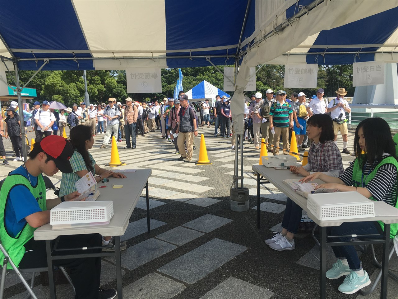 事前受付の人はここで送られてきたはがきを出し、ゼッケンやパスポート、地図、スポンサー資料などを受け取る。奥にいる人たちは受付待ちのBコースの人たちだ。
