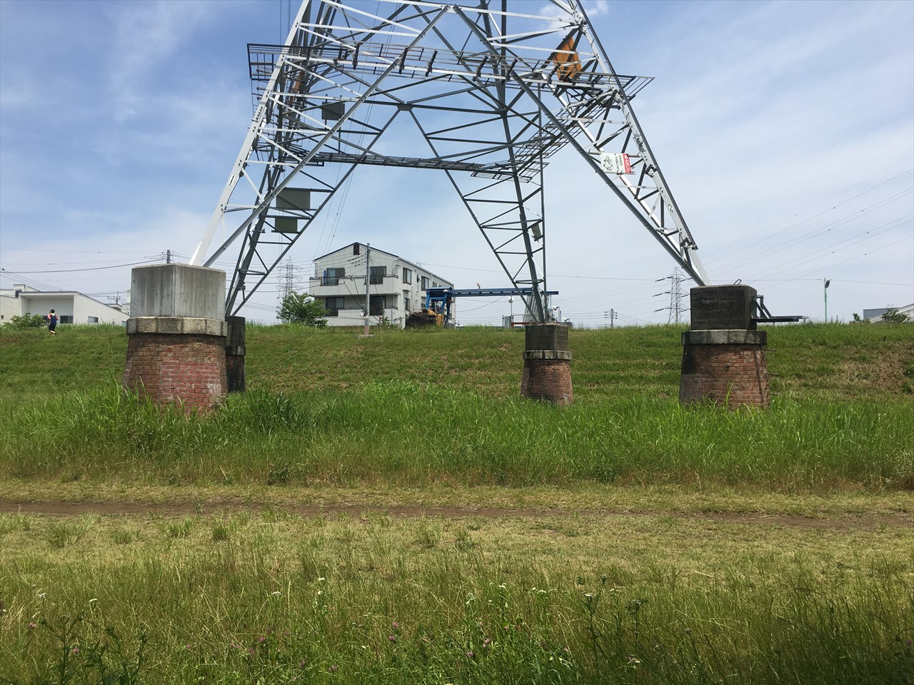 送電線の鉄塔の土台がレンガ。