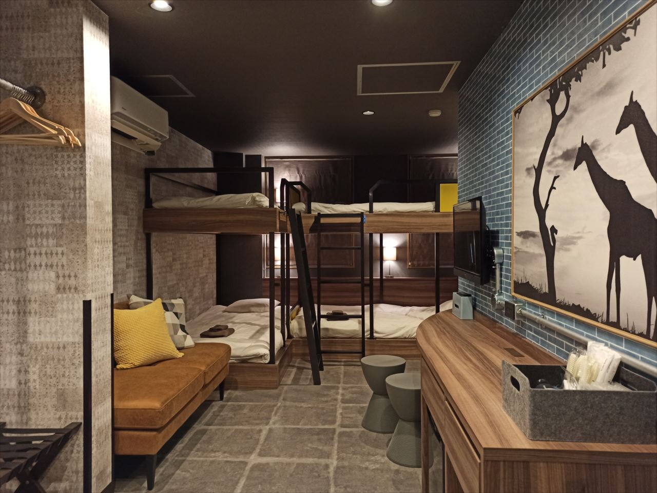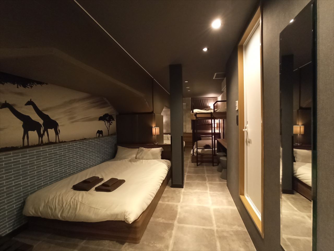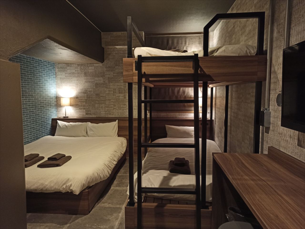 例えばこの部屋であれば、手前に通常のベッドがひとつ。奥に二段ベッドと通常のベッドがひとつずつ。