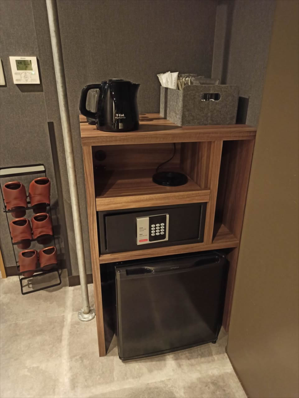 電気ポットに金庫、ミニ冷蔵庫も。