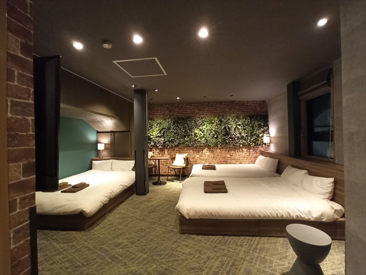 レンガ模様の壁にフェイクの観葉植物がアレンジされているのがホテルの部屋としてはなかなか新鮮。