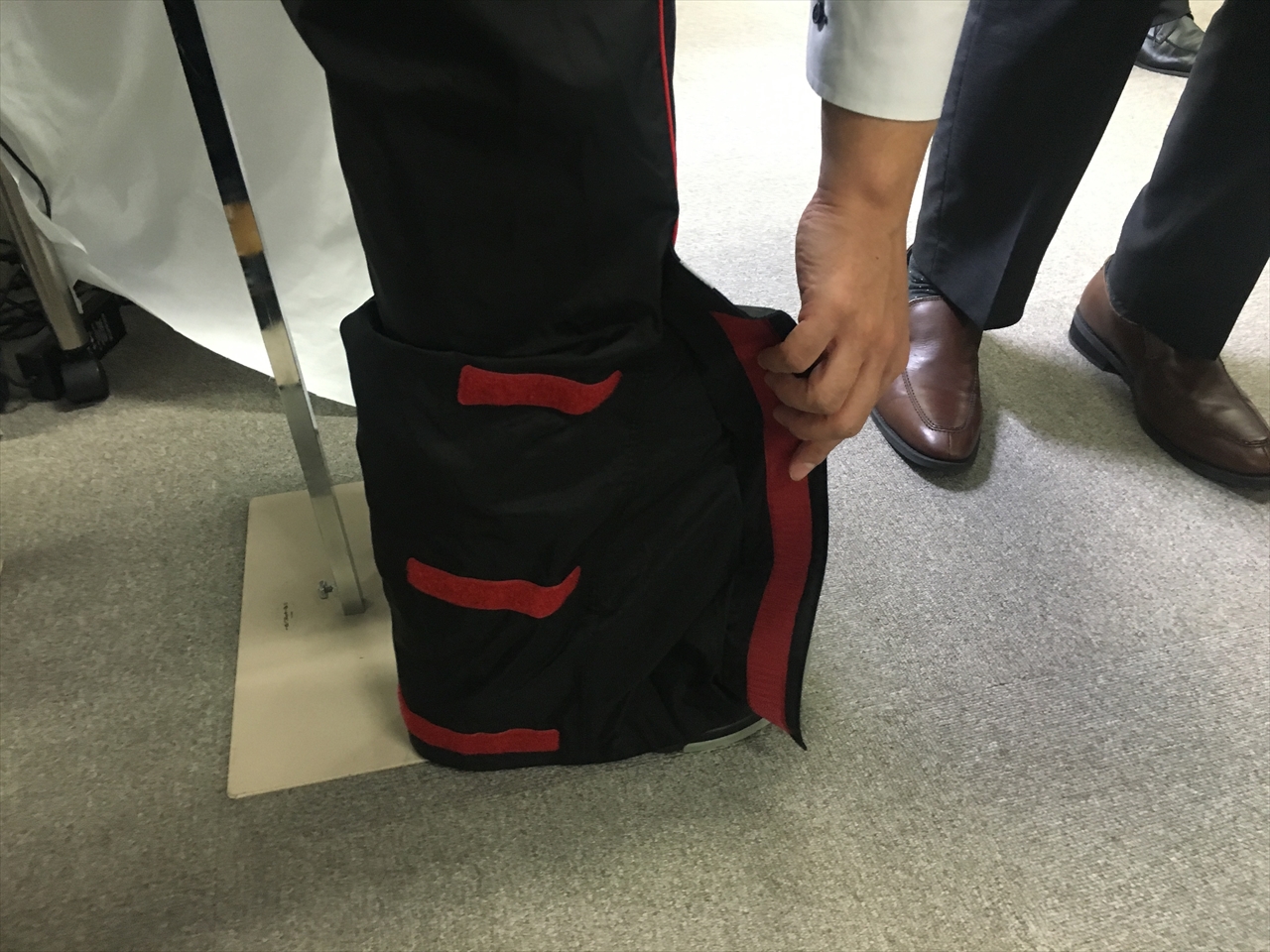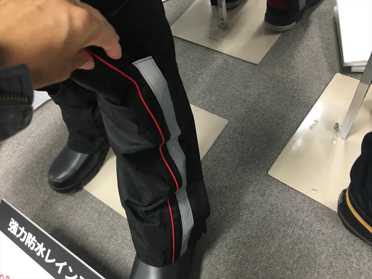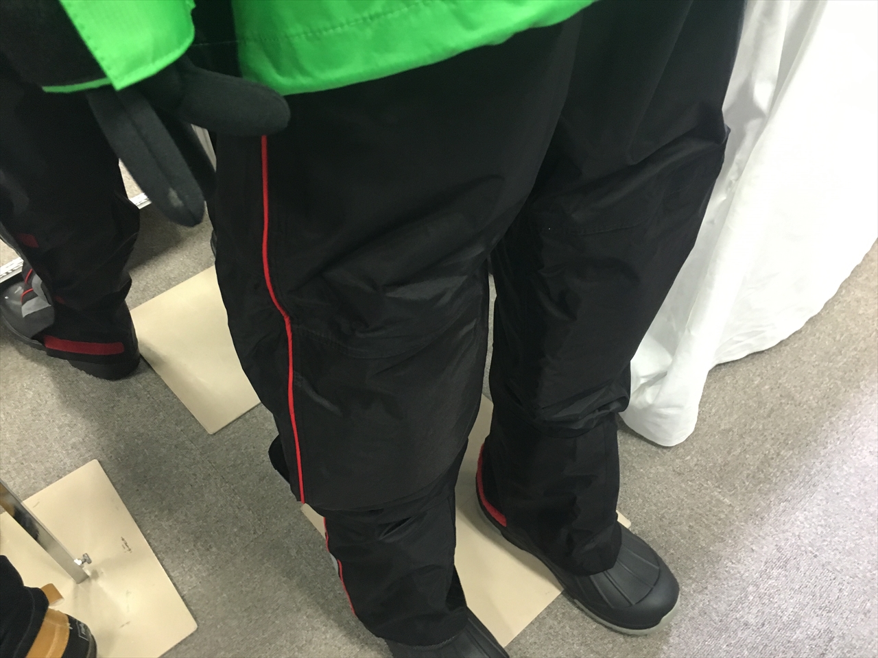 真横から見るとこんな感じで、ブーツ履いたままパンツを履くことができるそう。そして履いたら三か所のマジックテープに貼りつけ、裾から風や雨が入ってこないようにする。