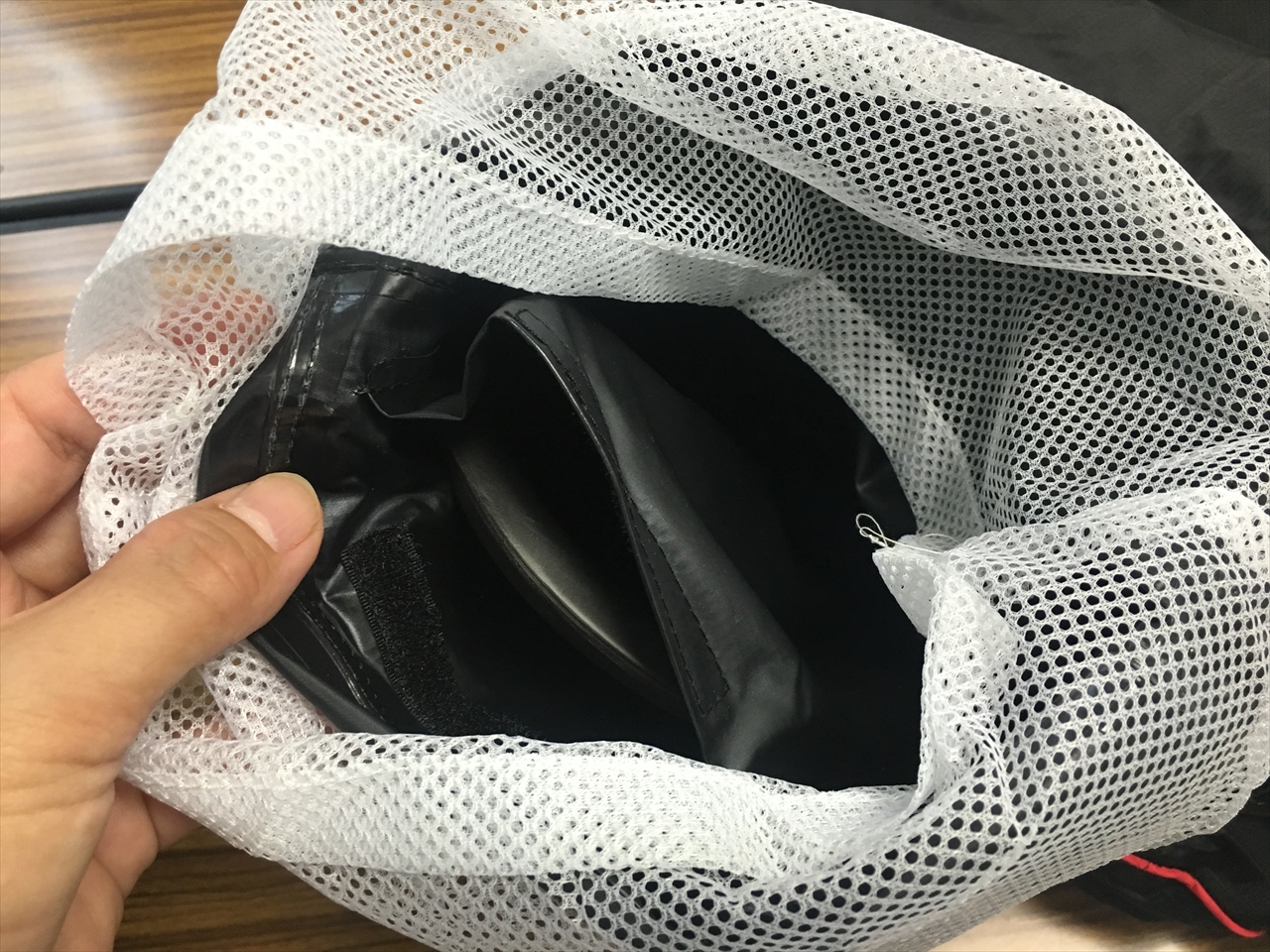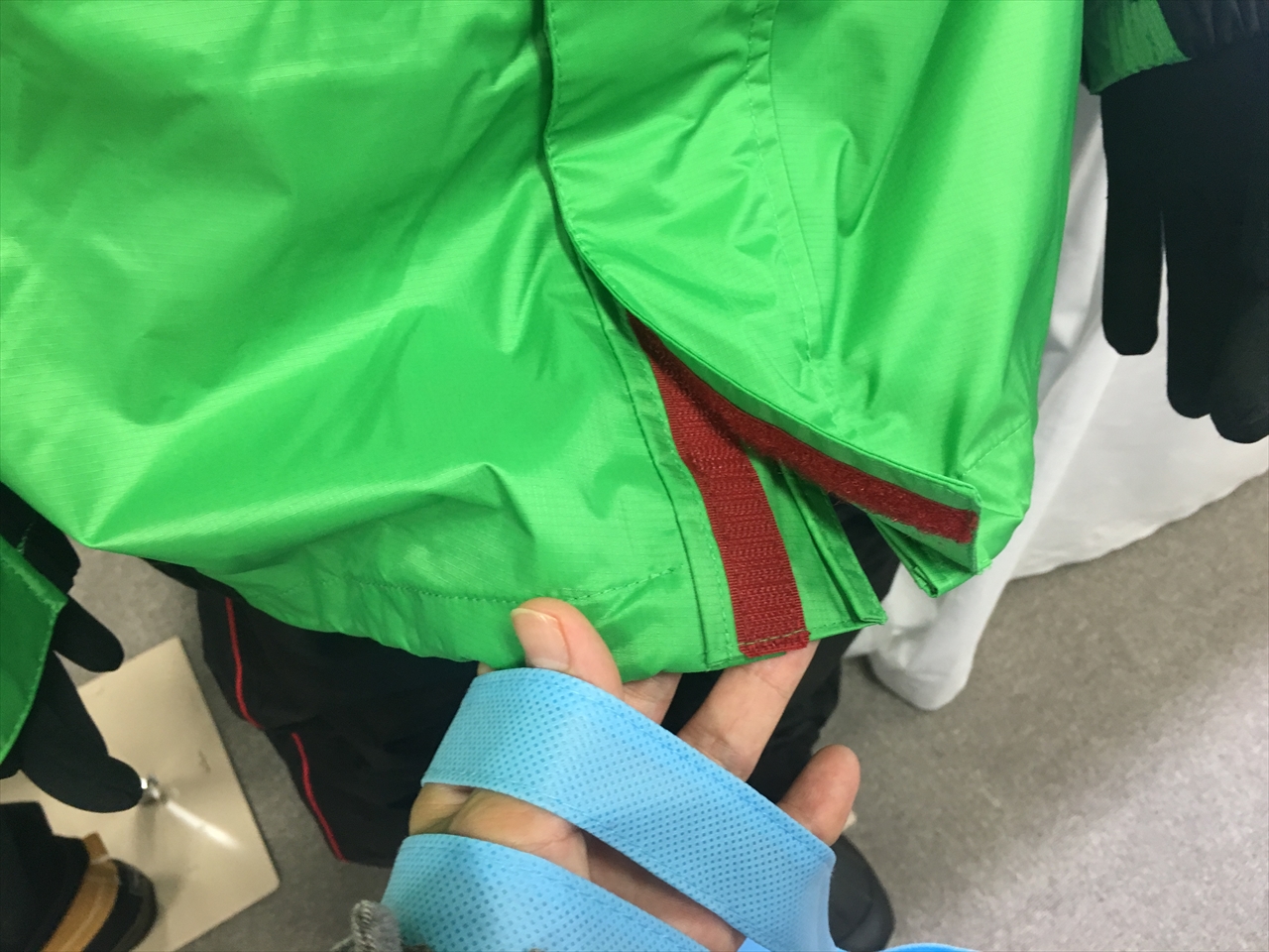 これを絞ることでバタつきを防止できるそう。確かに脱ぎ着する時はゆとりが欲しいけど、走行時にバタバタするのは煩わしいし、それが長時間続くと疲れてもくるもの。