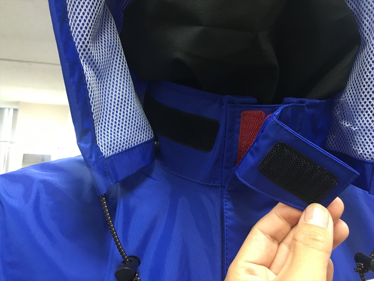 レインジャケットの首回りも結構な高さがあり、あごはすっぽり覆うことが可能。マジックテープでがっちり止めることができる。