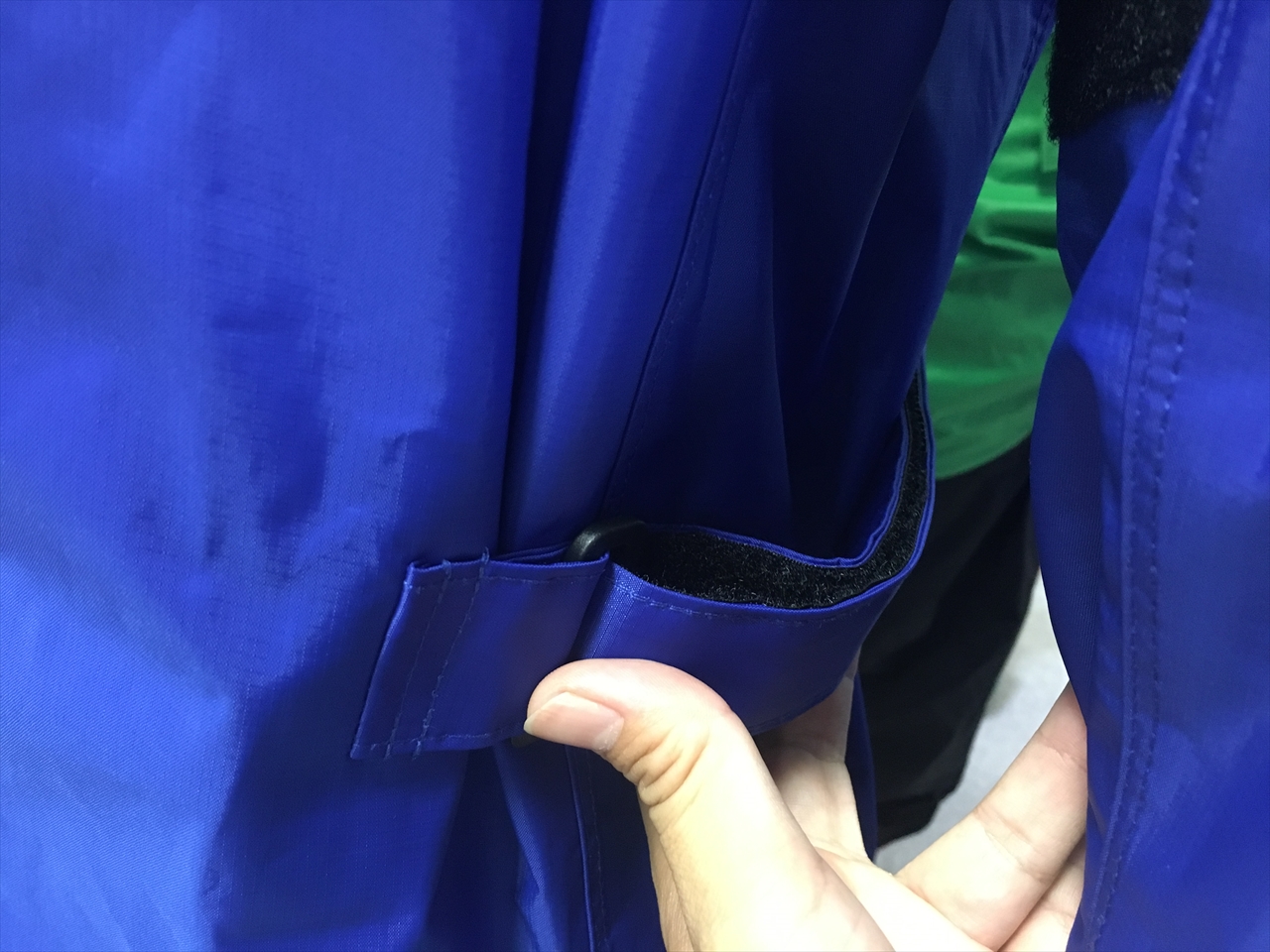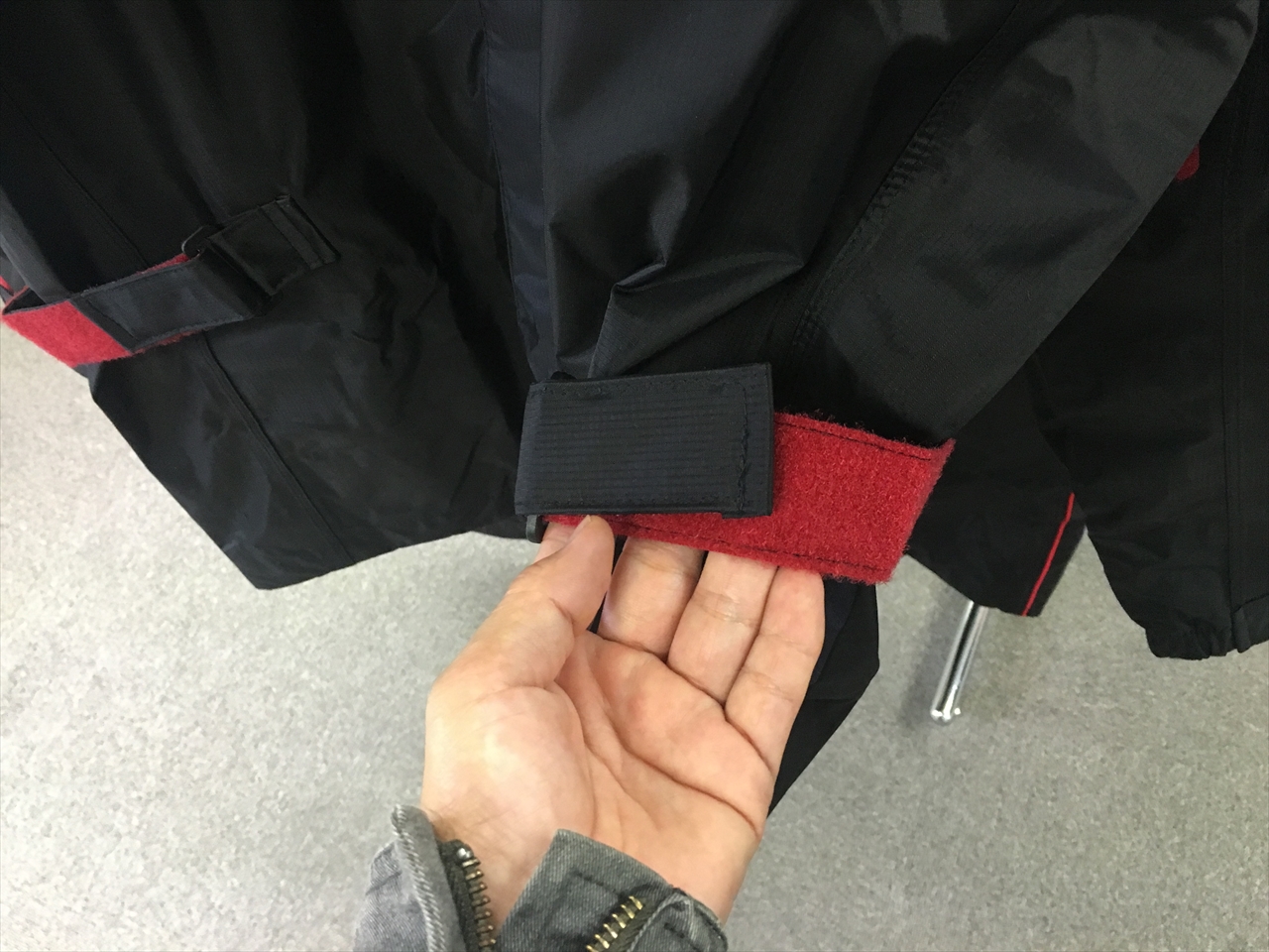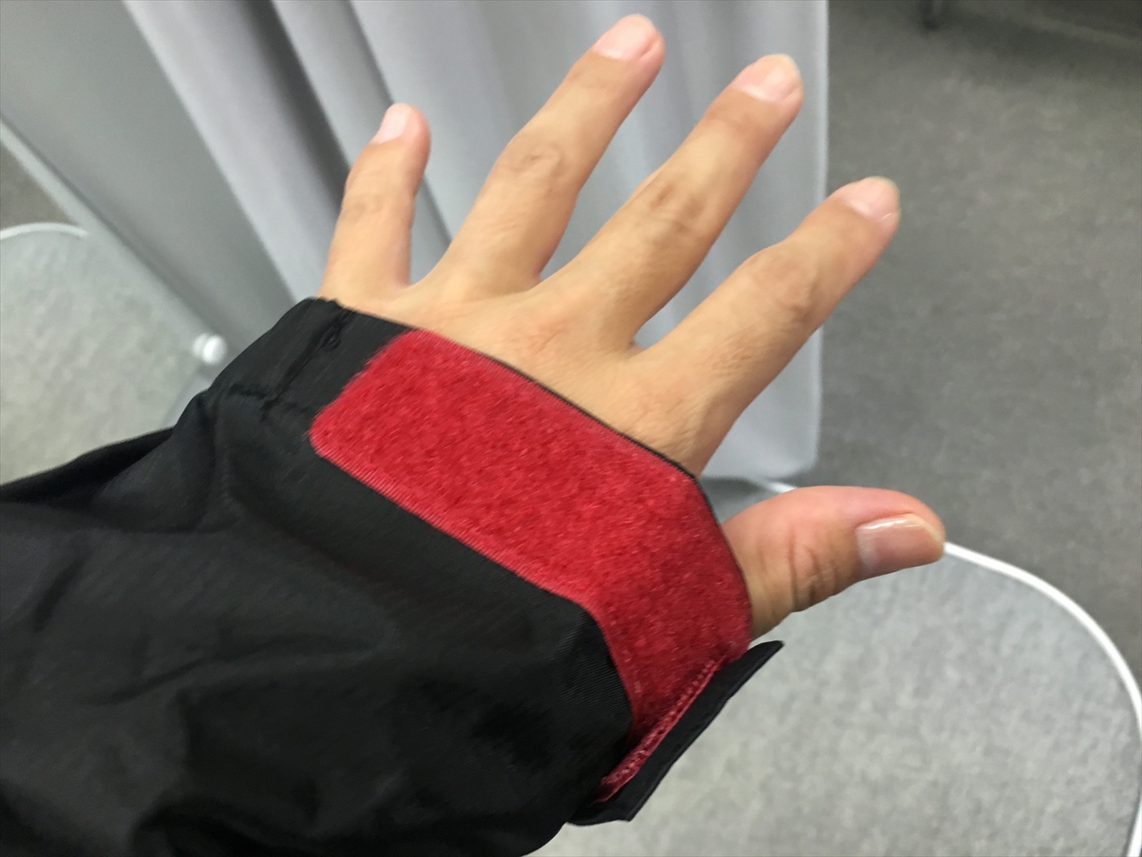 袖はこのくらい余るが、これもグローブの上からぎゅっとアジャスター絞れば隙間をなくせる。