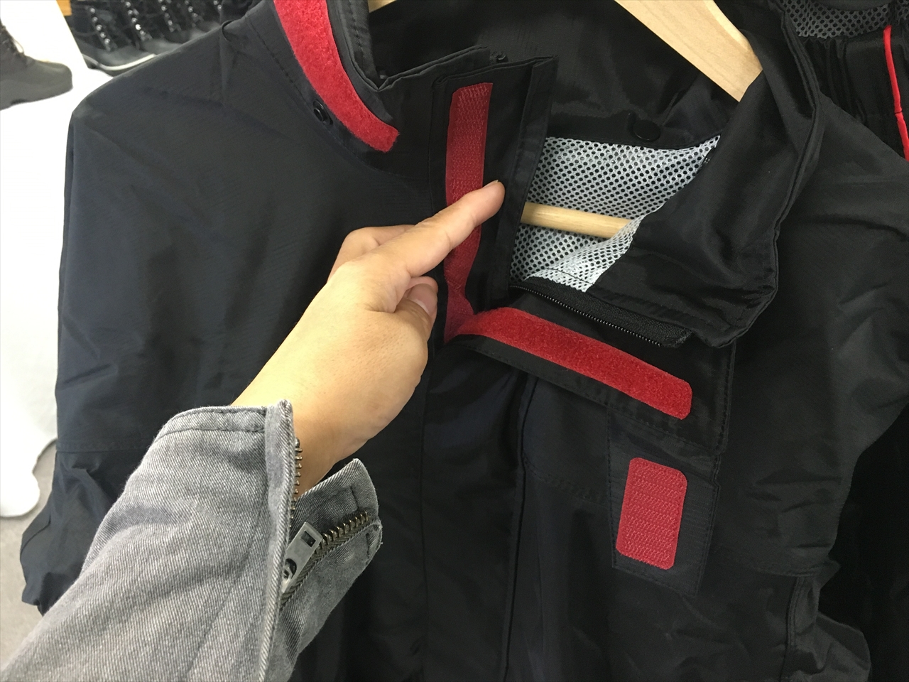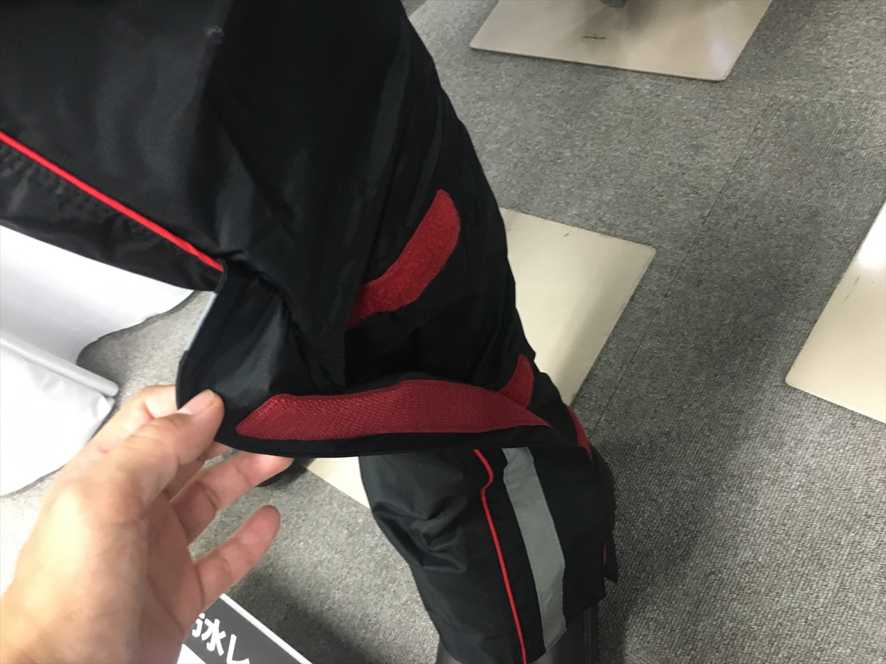 バイク用のレインスーツとして最適化されており、例えば前のファスナー部分は重ね合わせてマジックテープを上から下までびっしりつけることで正面からの風圧でも雨が浸透しないような作りになっている。