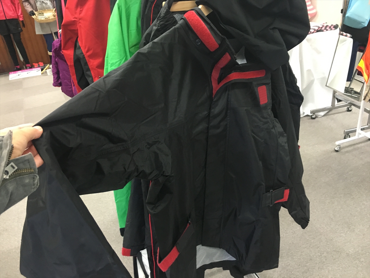 主力のお仕事用「作業着」ではなく、釣りやバイク、そして登山といったアウトドア用途の商品中心にずらり。興味深いものだらけだったが、やはりまずは自分の主目的だったバイク用レインスーツ「BIKERS」を紹介しよう。