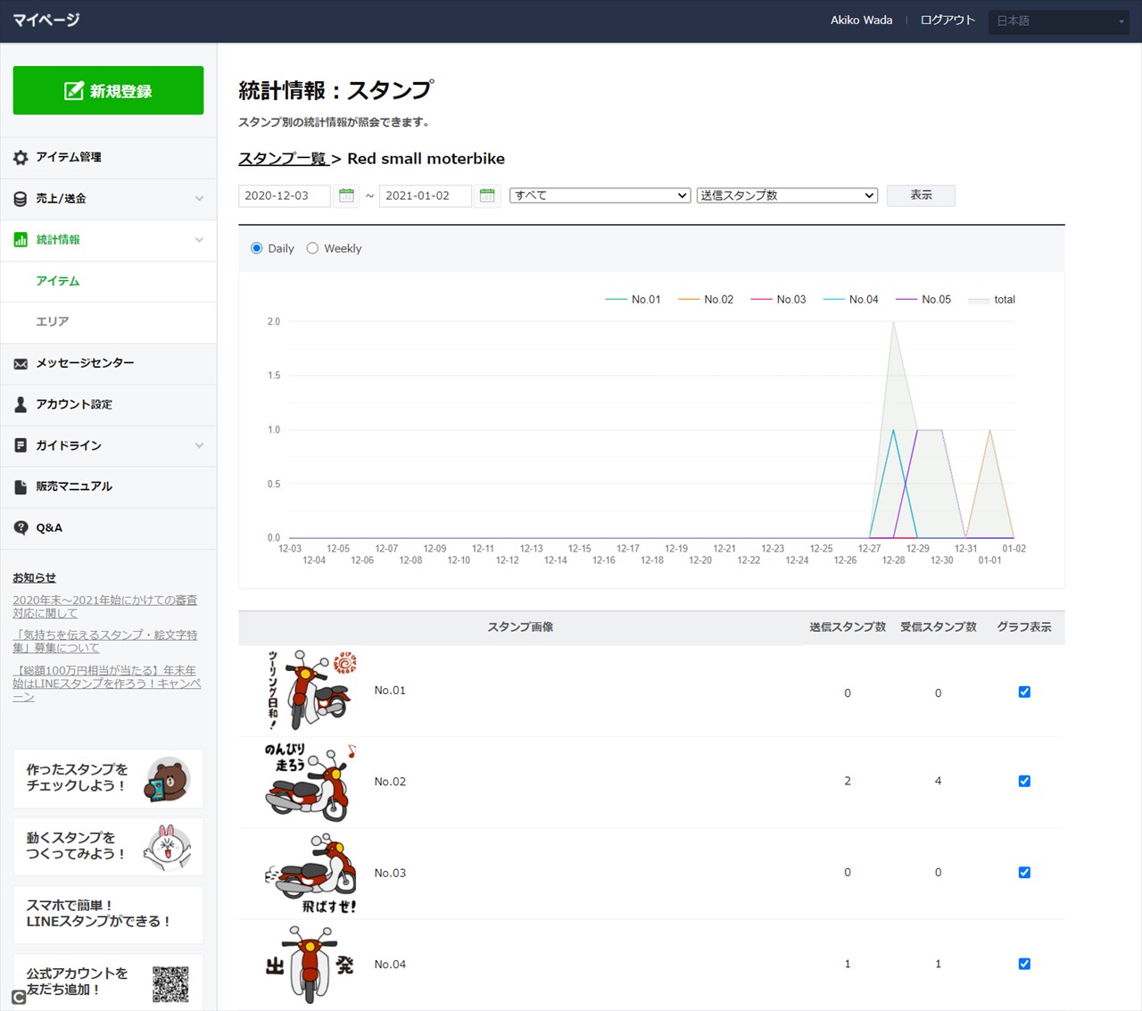 お世話になったカブ乗りの方数人にLINEスタンプ進呈し、それ以外に買ってくれた方もいて、さっそく管理画面で利用状況なども確認できるようになった。