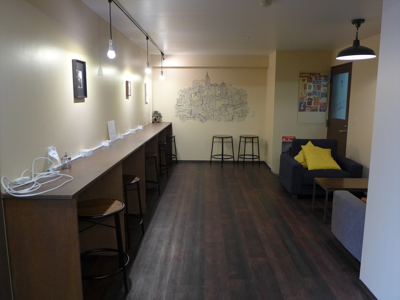 リビングの奥にも、カウンターと丸テーブルが並ぶ空間。机の上には電源タップが置かれている。パソコン作業などをここでやっている人も多い。