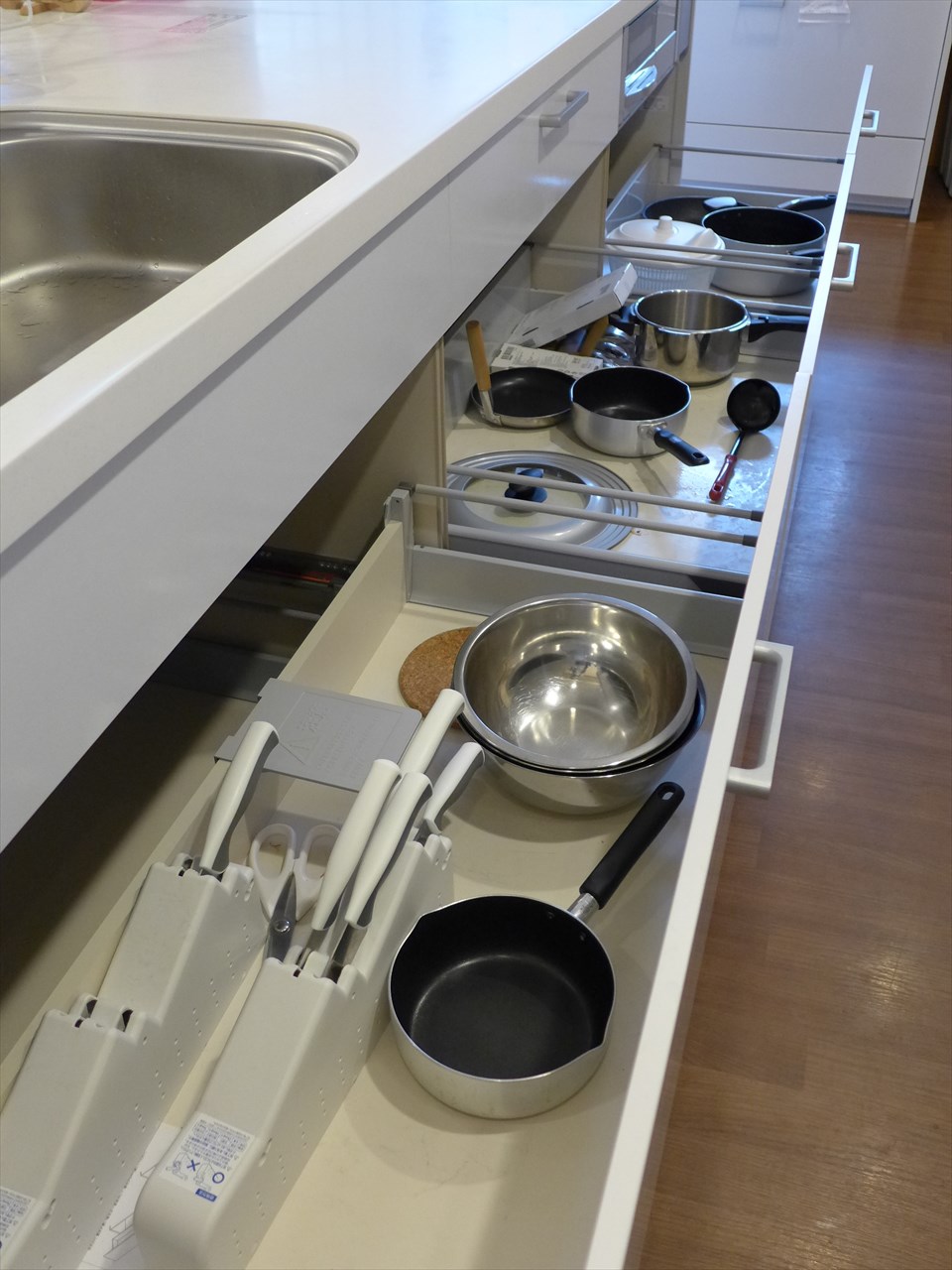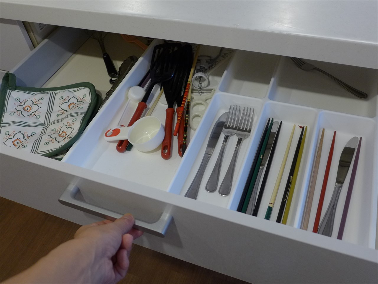 調理台の引き出しにはフォークやお箸、フライ返しや野菜の皮むきなど。必要なものは大体なんでも揃っている。
