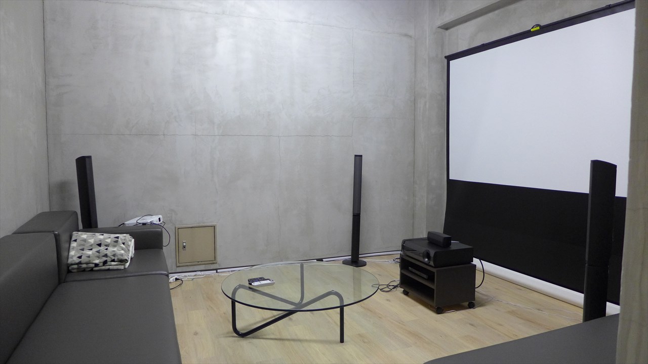 中は打ちっぱなしの壁に巨大スクリーンとプロジェクター。スピーカーシステムも整っている。