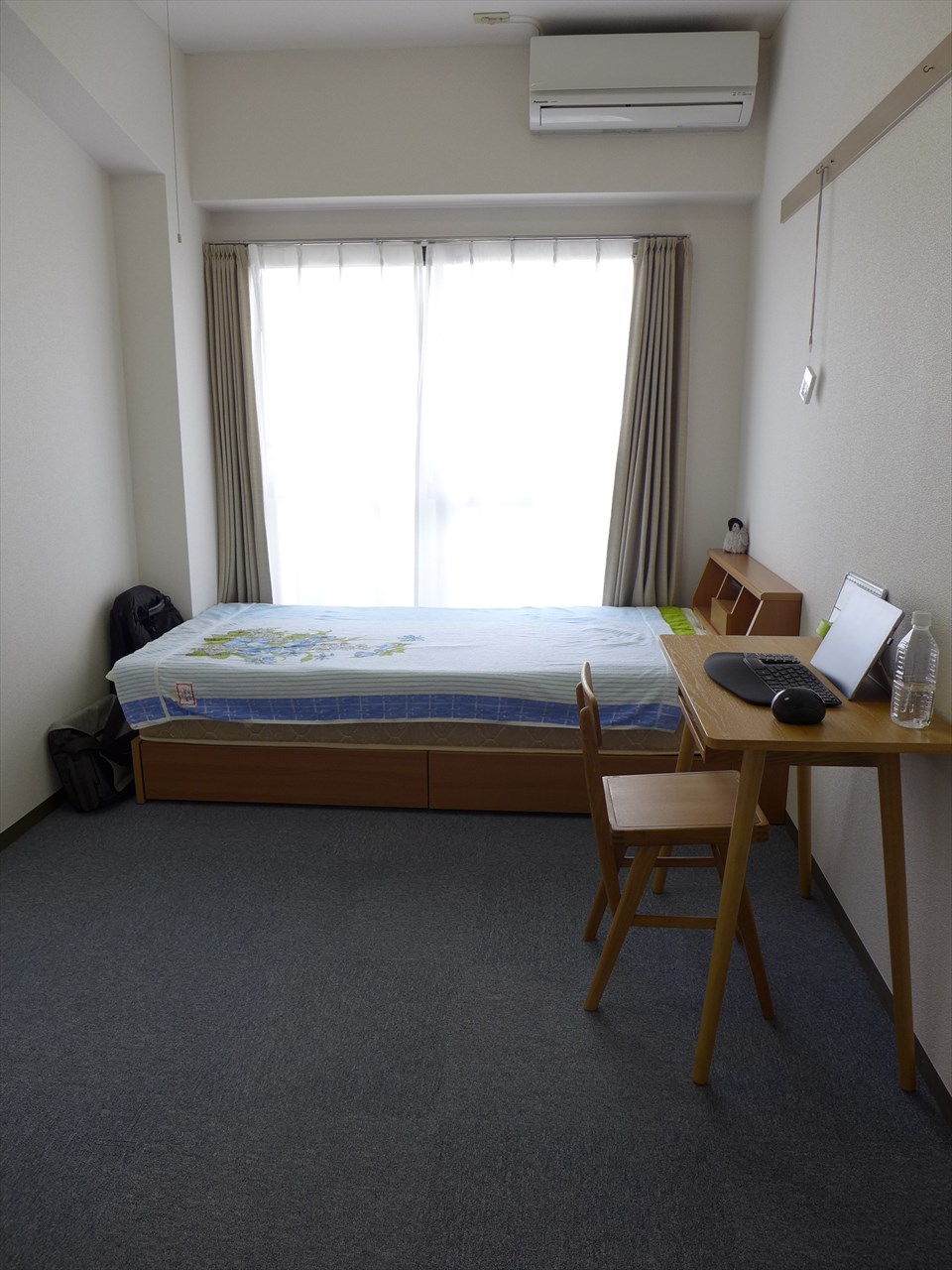 ベッドを窓際にくっつけることで、手前スペースが正方形に近いスペースになり、使い勝手もよくなり、少し広くなった気もする。