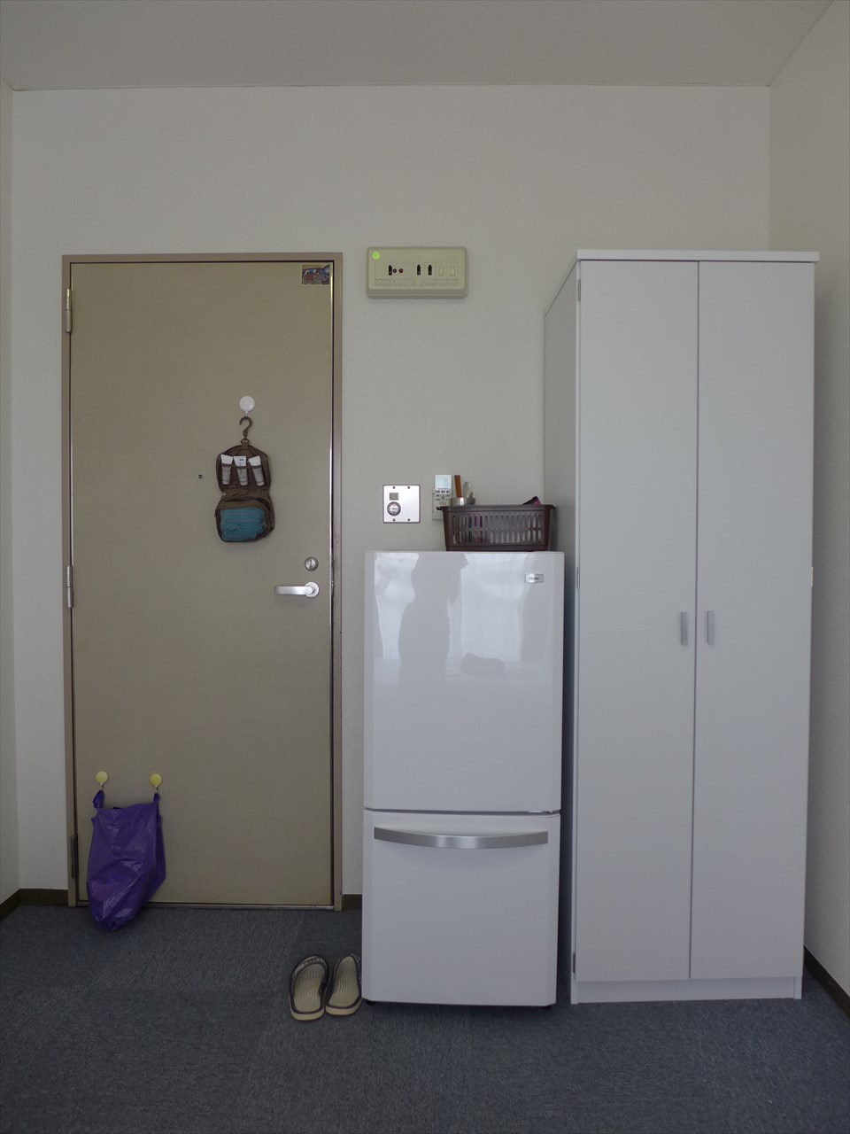 ベッドから入り口方向を見ると、クローゼットと冷蔵庫が並んでいる。これは入居二日目風景なので、マグネットフックを使って、扉にお風呂セットをひっかけ、臨時のゴミ箱を作ってある。